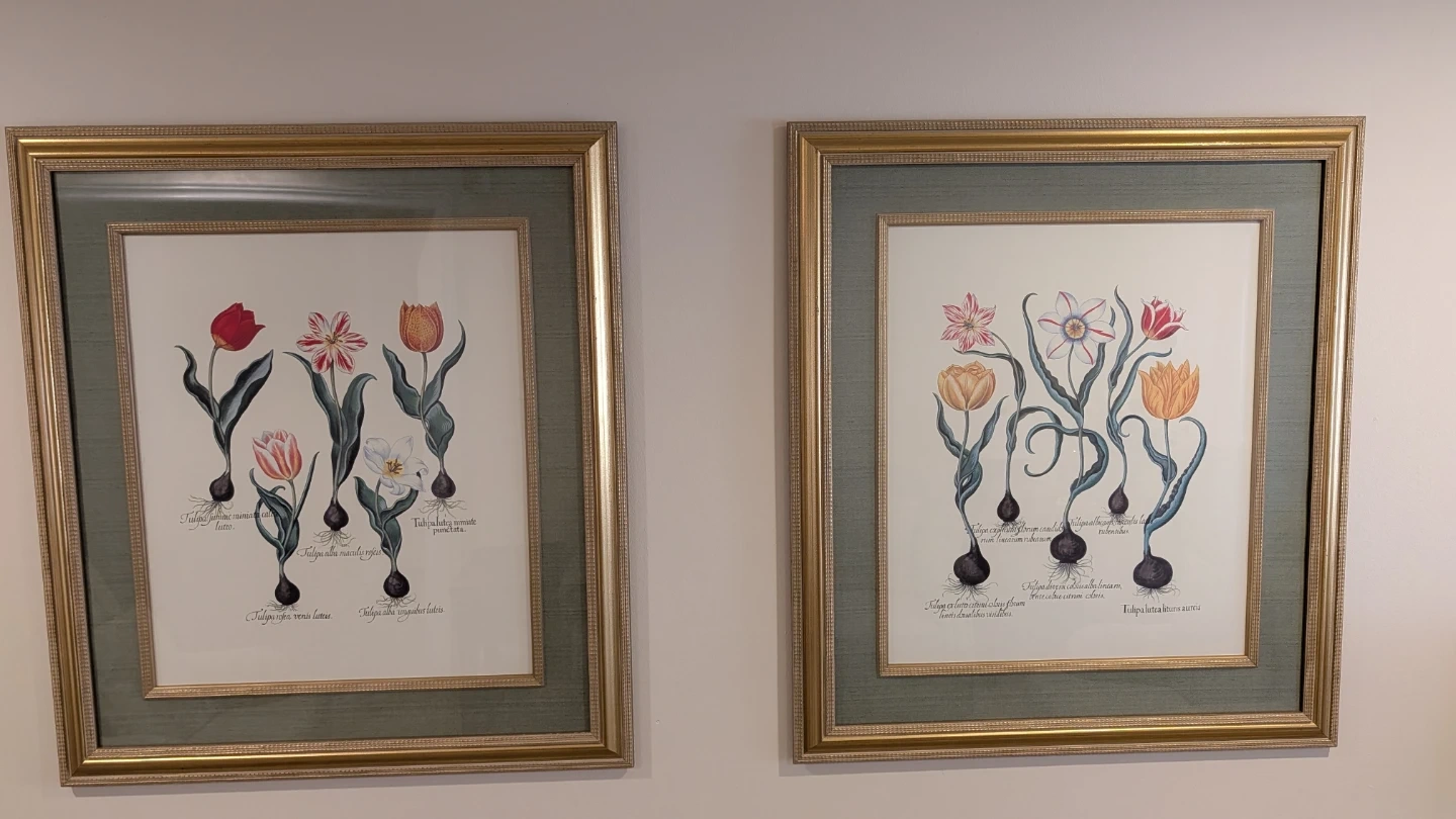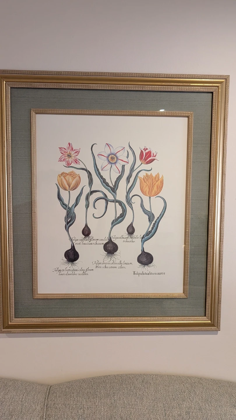 Framed botanical print featuring illustrations of flowers .The artwork includes Latin text and is housed in a gold-toned frame with a sage green mat. Perfect for adding a touch of vintage charm to any room!