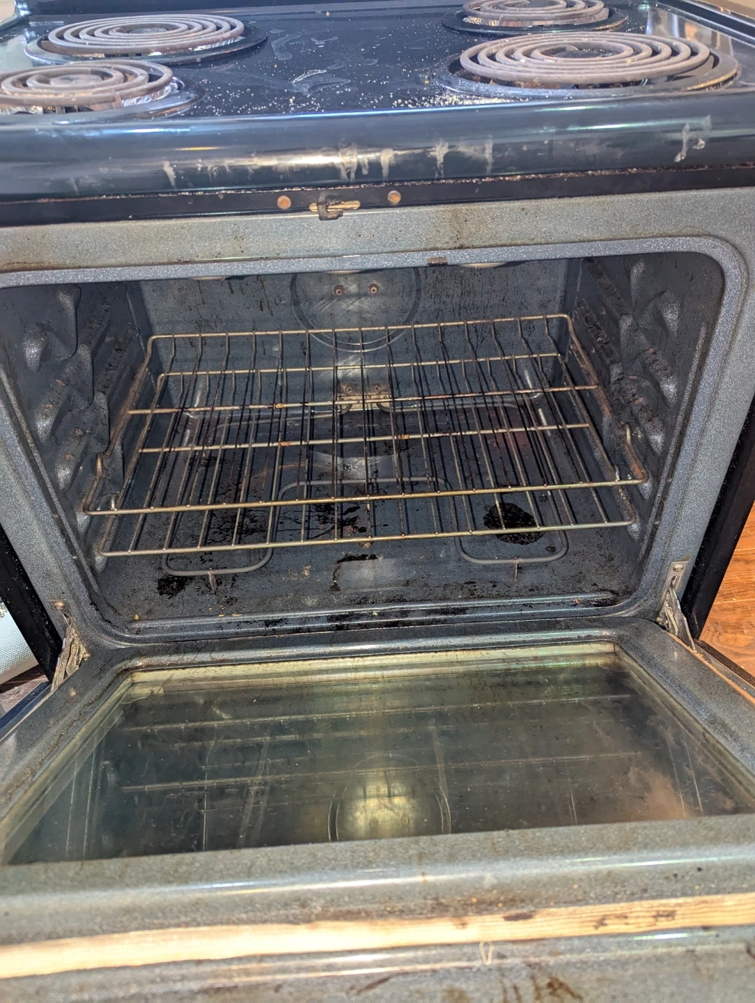 This is a black Frigidaire electric stove with four coil burners and an oven. It includes one oven rack. This stove is suitable for home kitchens.