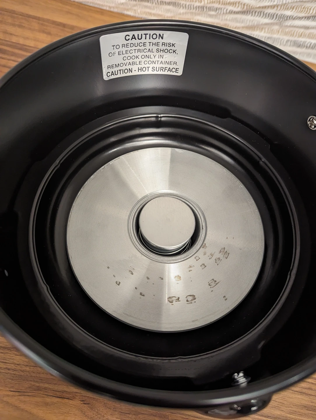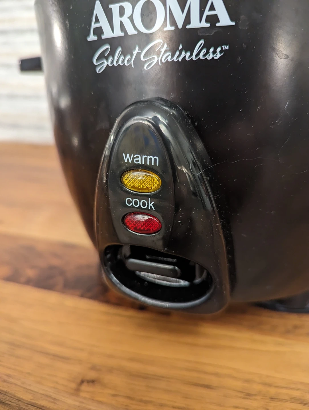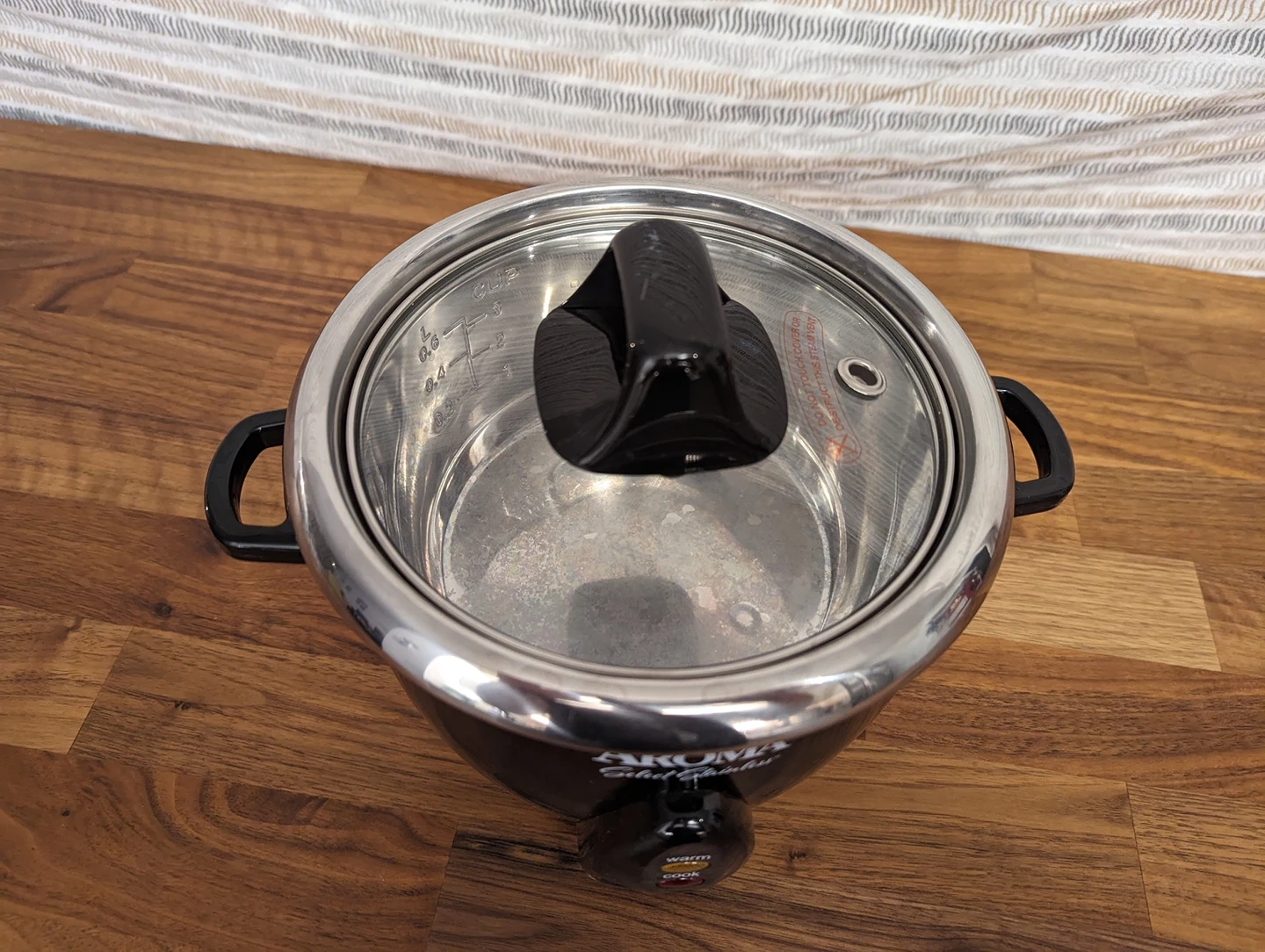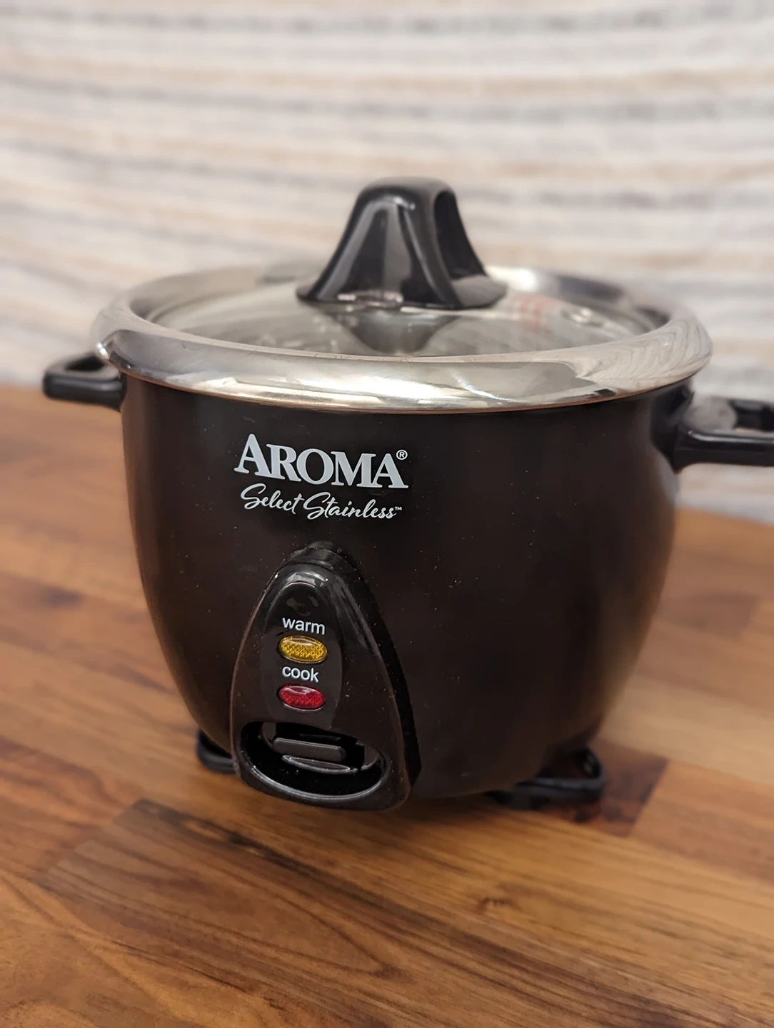 Has a warming function to keep rice warm. Can also hear up soups if needed. Great for small kitchens as it's not large (1 L)