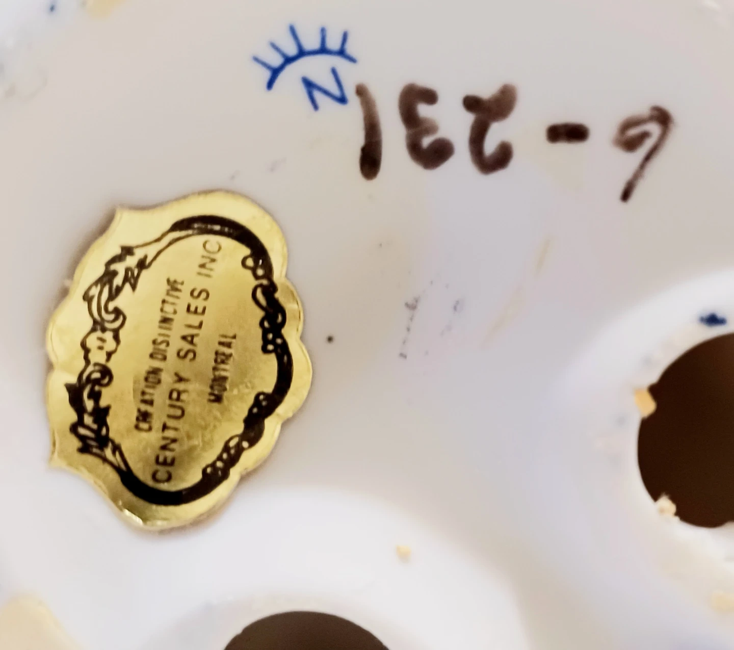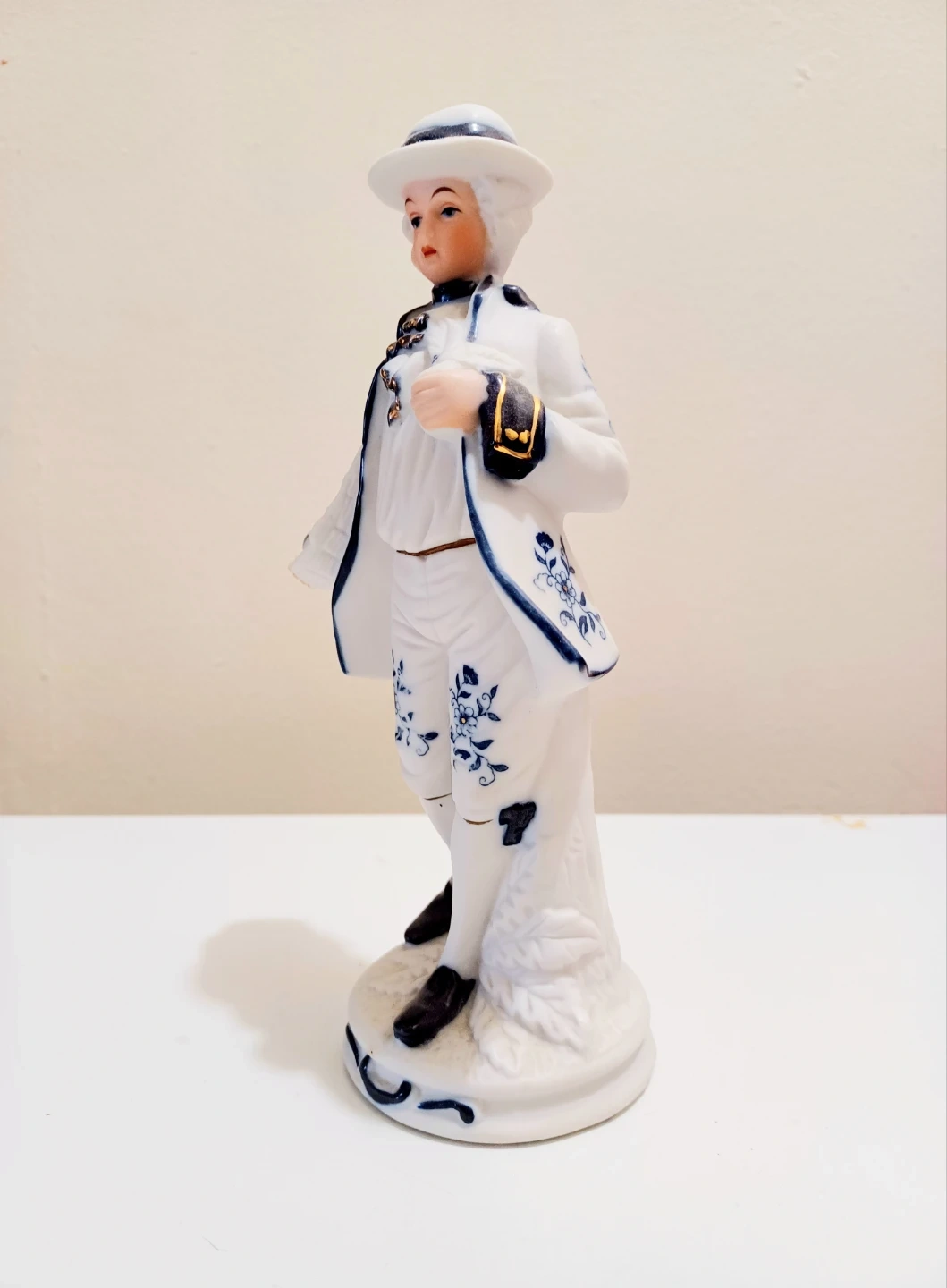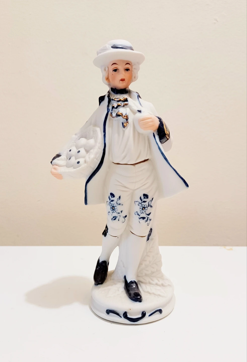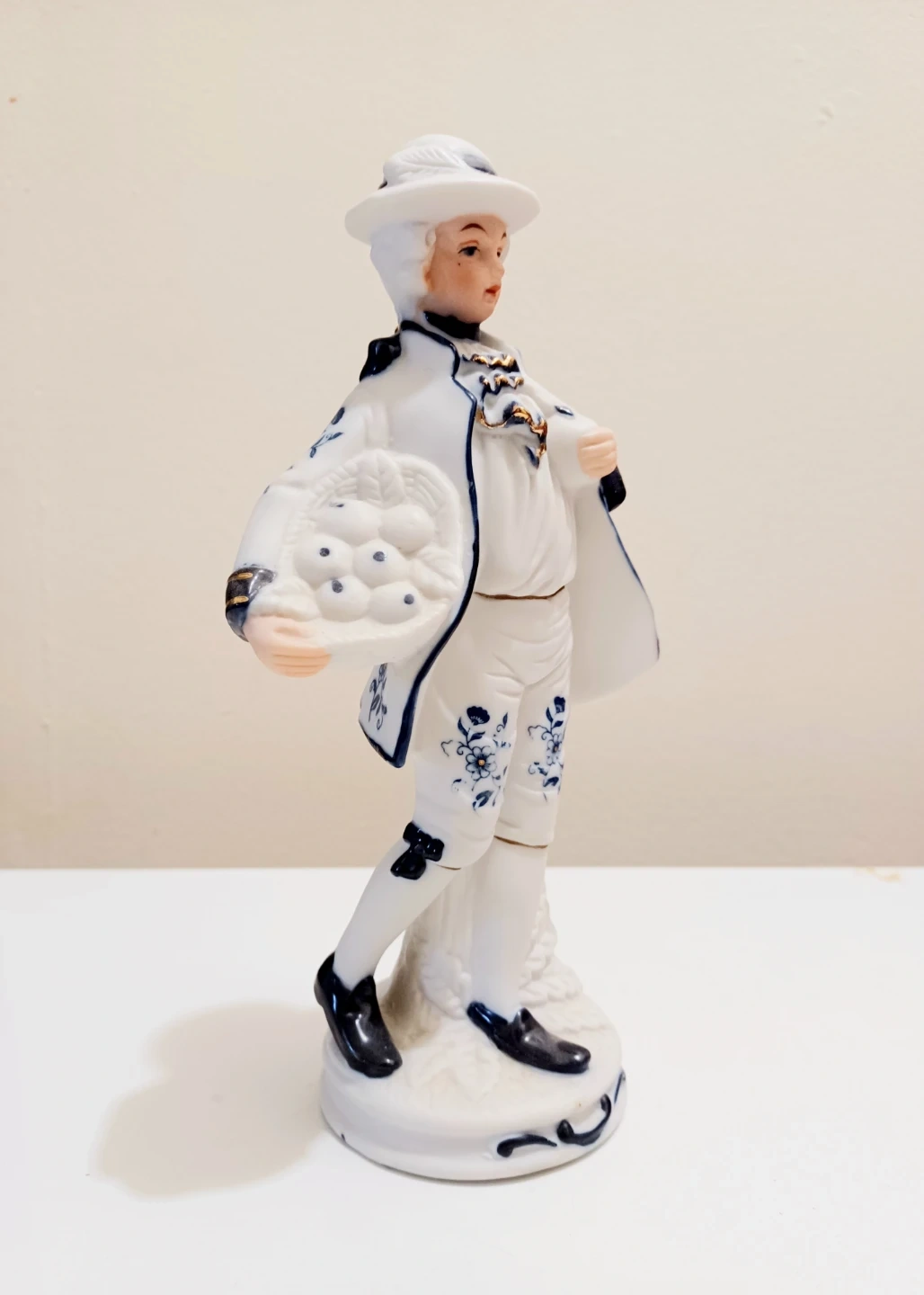 Vintage, Century Sales Inc. porcelain figurine of a man in 18th-century attire. It depicts a man in period attire holding a basket of fruit. The figurine features intricate blue floral detailing on the pants and coat. Standing 22 cm tall. This piece is marked with 'Creation Distinctive Century Sales Inc. Montreal' and a production number. Very Good Condition, with Sticker