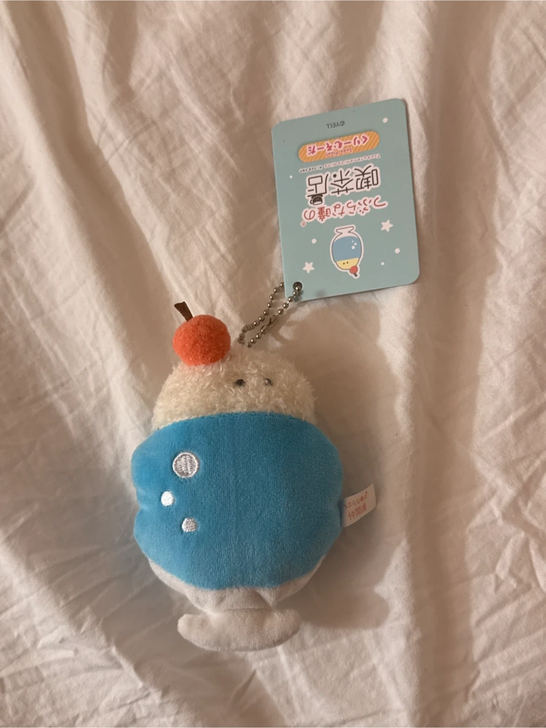 This is a YELL brand cream soda plushie charm. It's part of the "Tsuburana Hitomi no Kissa-ten" (Drowsy-eyed Coffee Shop) series. It has a fuzzy white top, a blue middle section with white dots, and a white base, topped with a cherry.