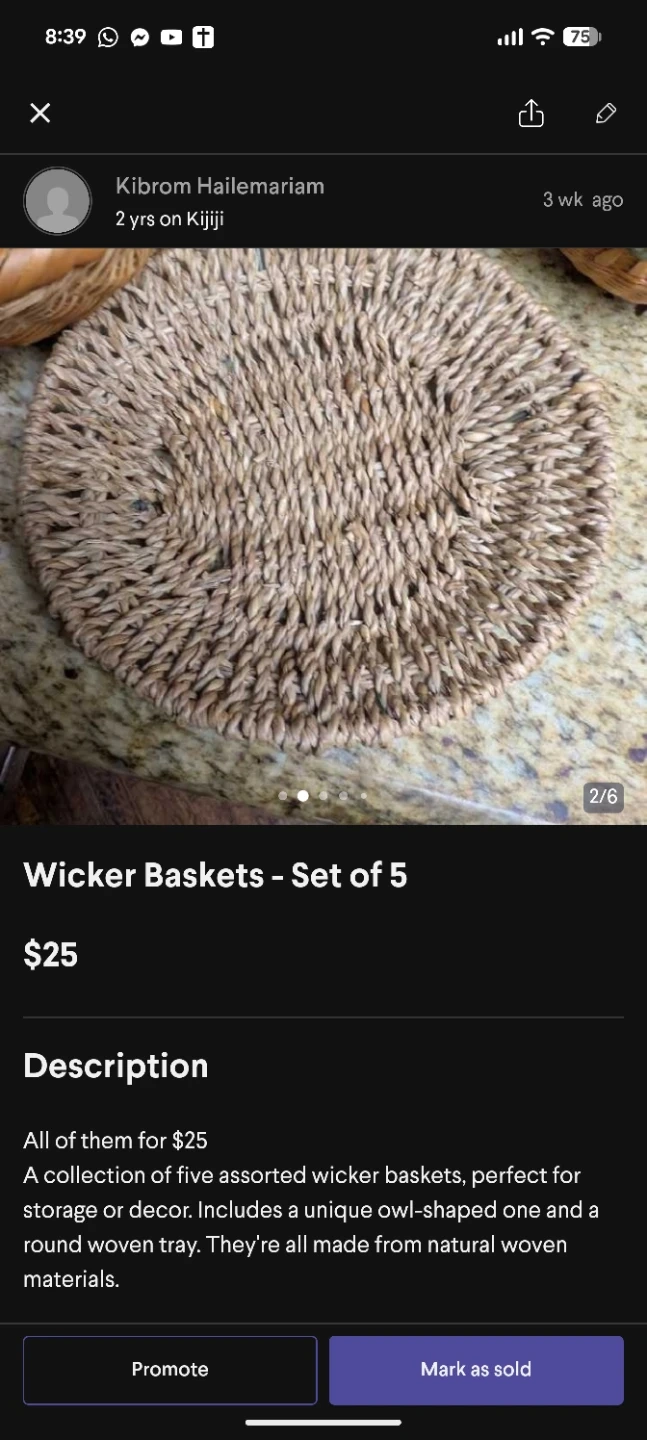 A collection of five assorted wicker baskets for storage or decor. Includes a unique owl-shaped one and a round woven tray. They're all made from natural woven materials.