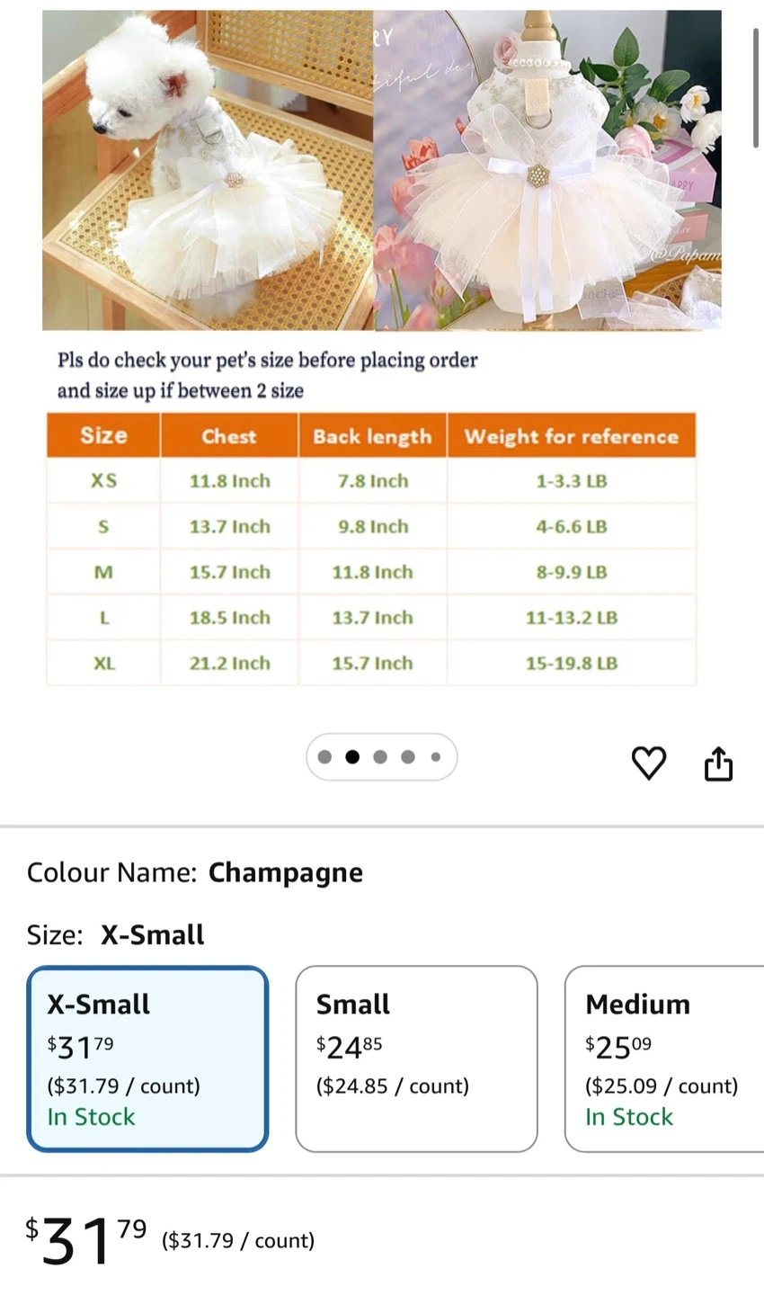Charming pet dress in a lovely champagne colour. It's made with delicate lace detailing and a full tulle skirt. This dress fastens with buttons at the back. It's perfect for special occasions or photos!