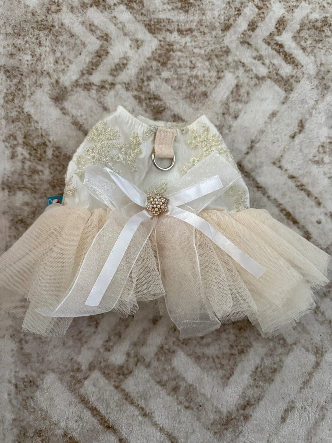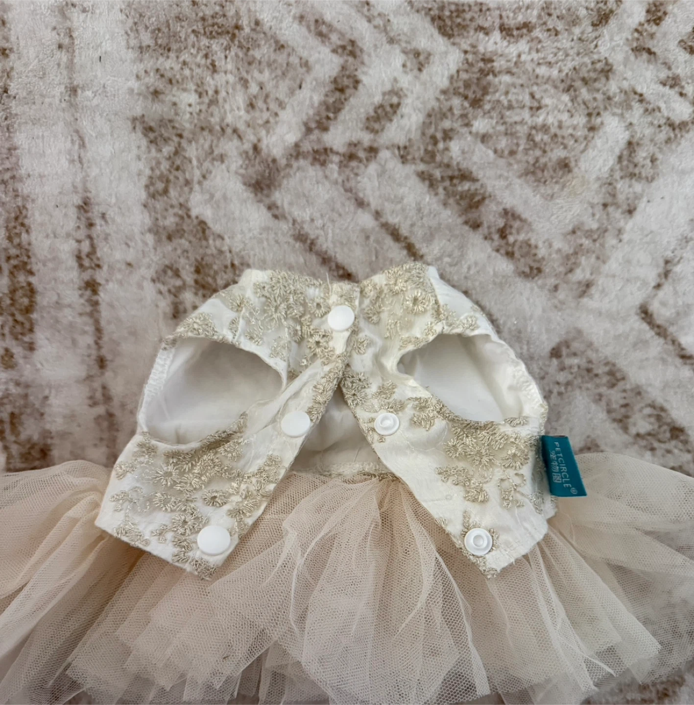 Charming pet dress in a lovely champagne colour. It's made with delicate lace detailing and a full tulle skirt. This dress fastens with buttons at the back. It's perfect for special occasions or photos!