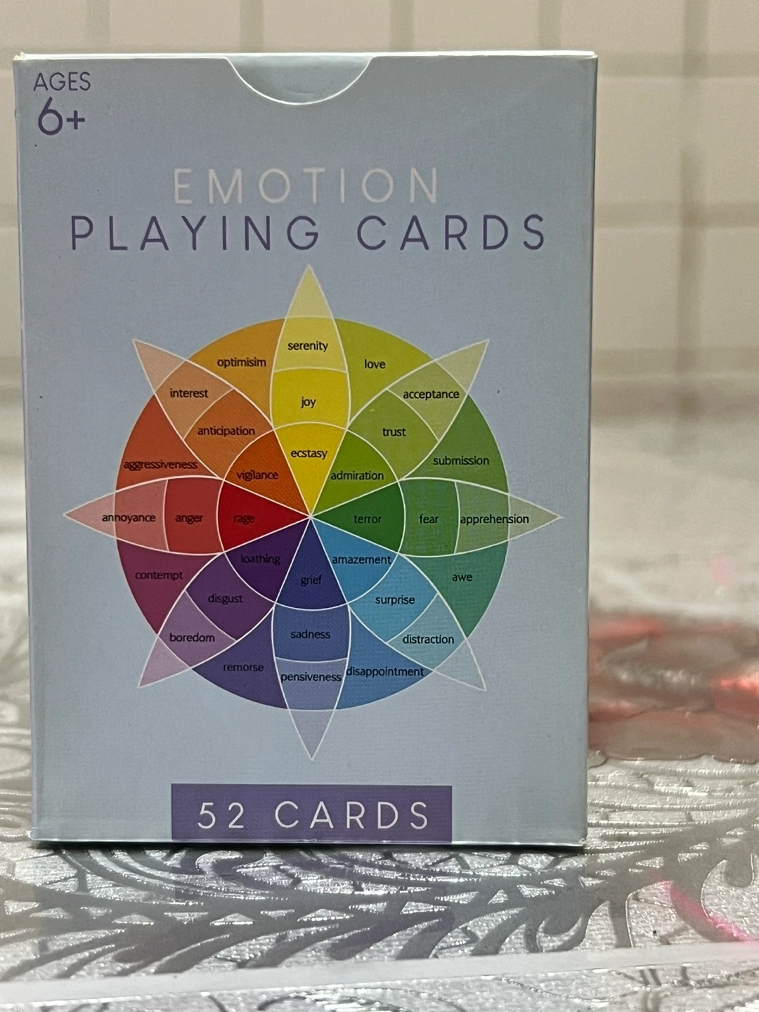 New deck of playing cards. 52 cards, ages 6+. Emotions depicted on cards.