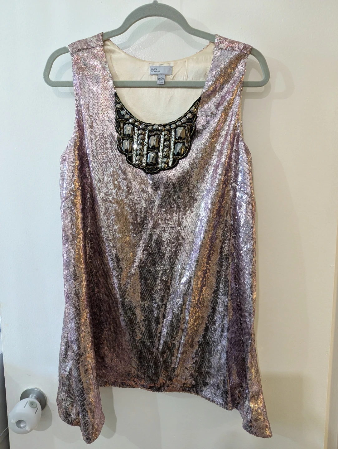 Linea Domani sleeveless top covered in shimmering sequins. It features a statement beaded neckline. Looks fantastic for a night out!