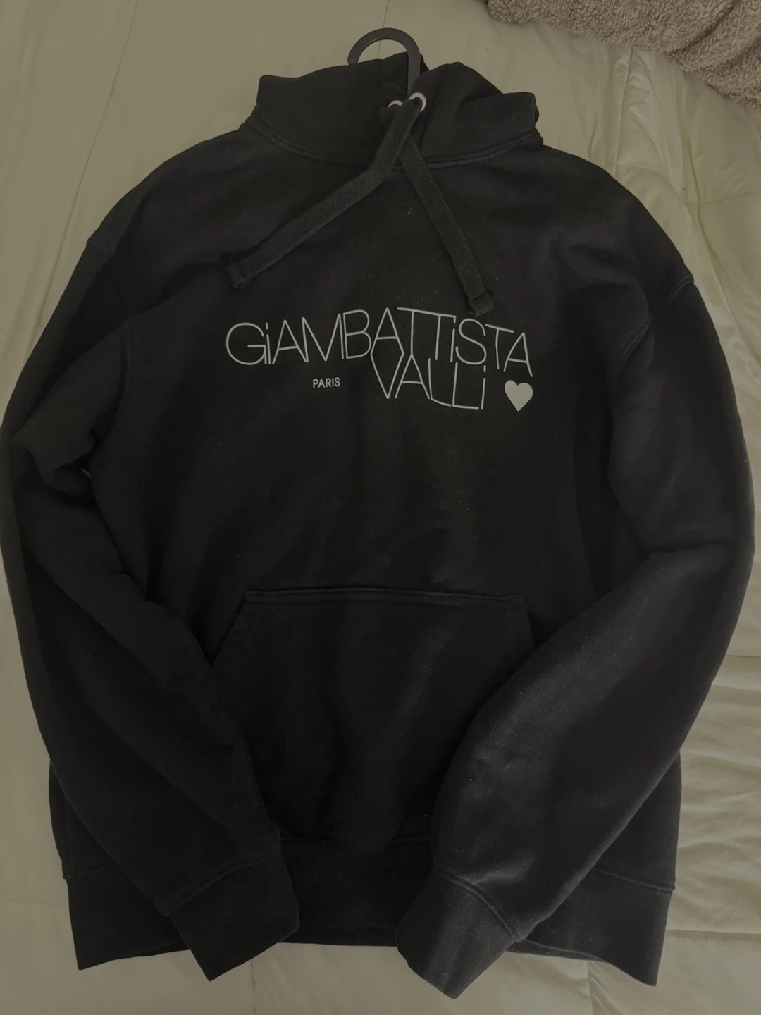 Black Giambattista Valli Paris hoodie. Features a front kangaroo pocket and drawstring hood. It's made of a soft cotton blend.