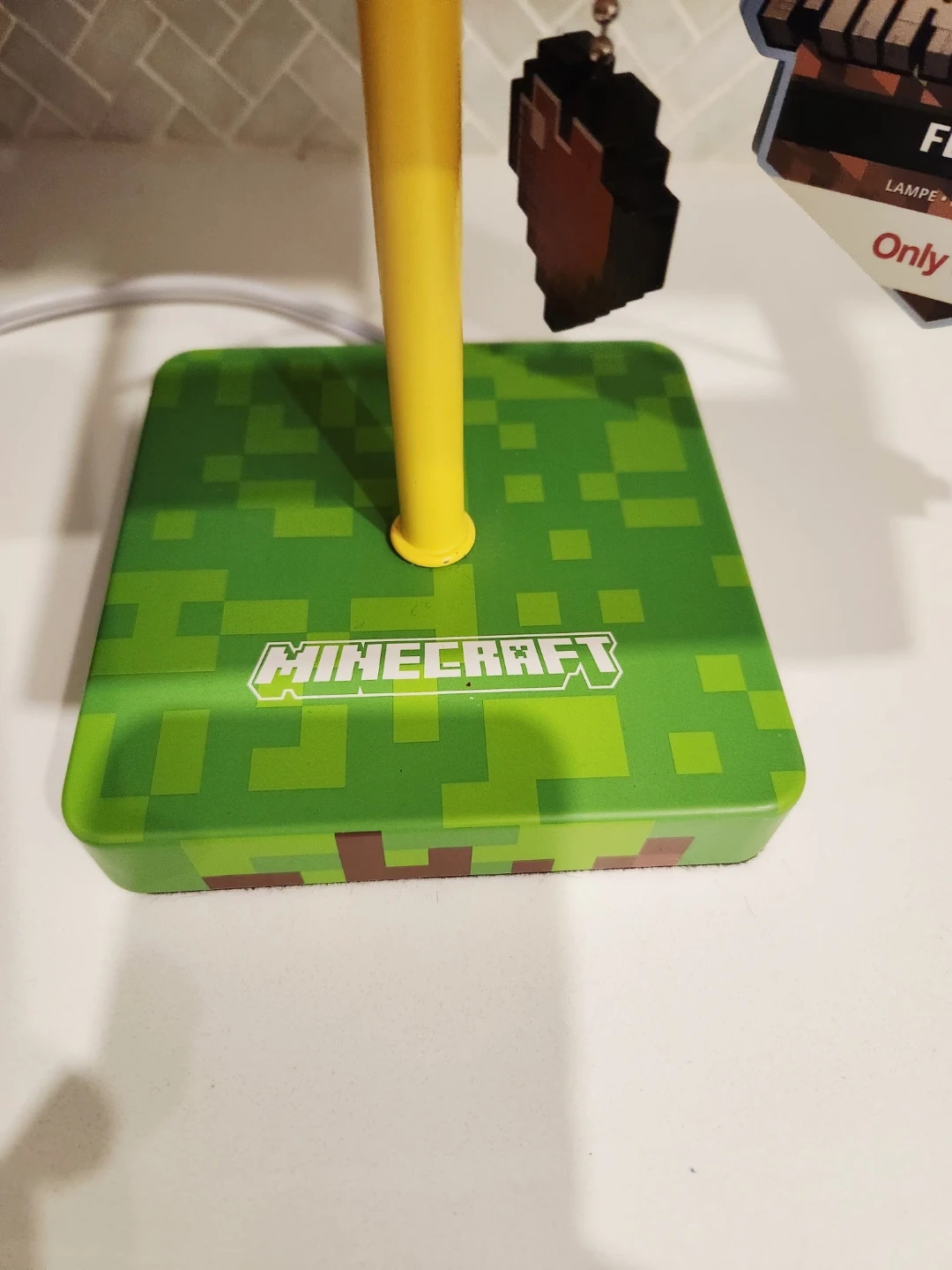 This Minecraft-themed table lamp features a pixelated fox design. It has a green, grass-block style base with the Minecraft logo. It's a fun addition to a gamer's room!