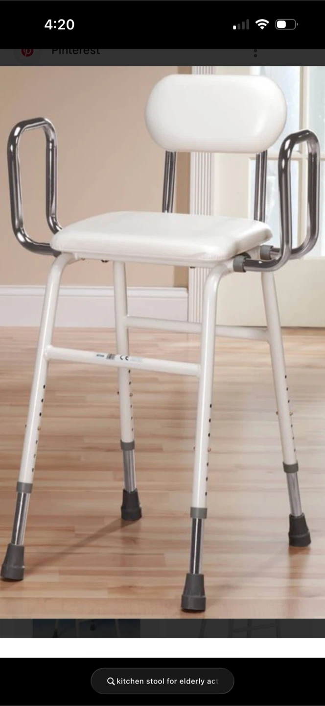 Selling a gently used chair designed for comfort and safety. It features adjustable height legs and supportive armrests, perfect for anyone needing a little extra help in the home. The chair is white with silver accents and in great condition!