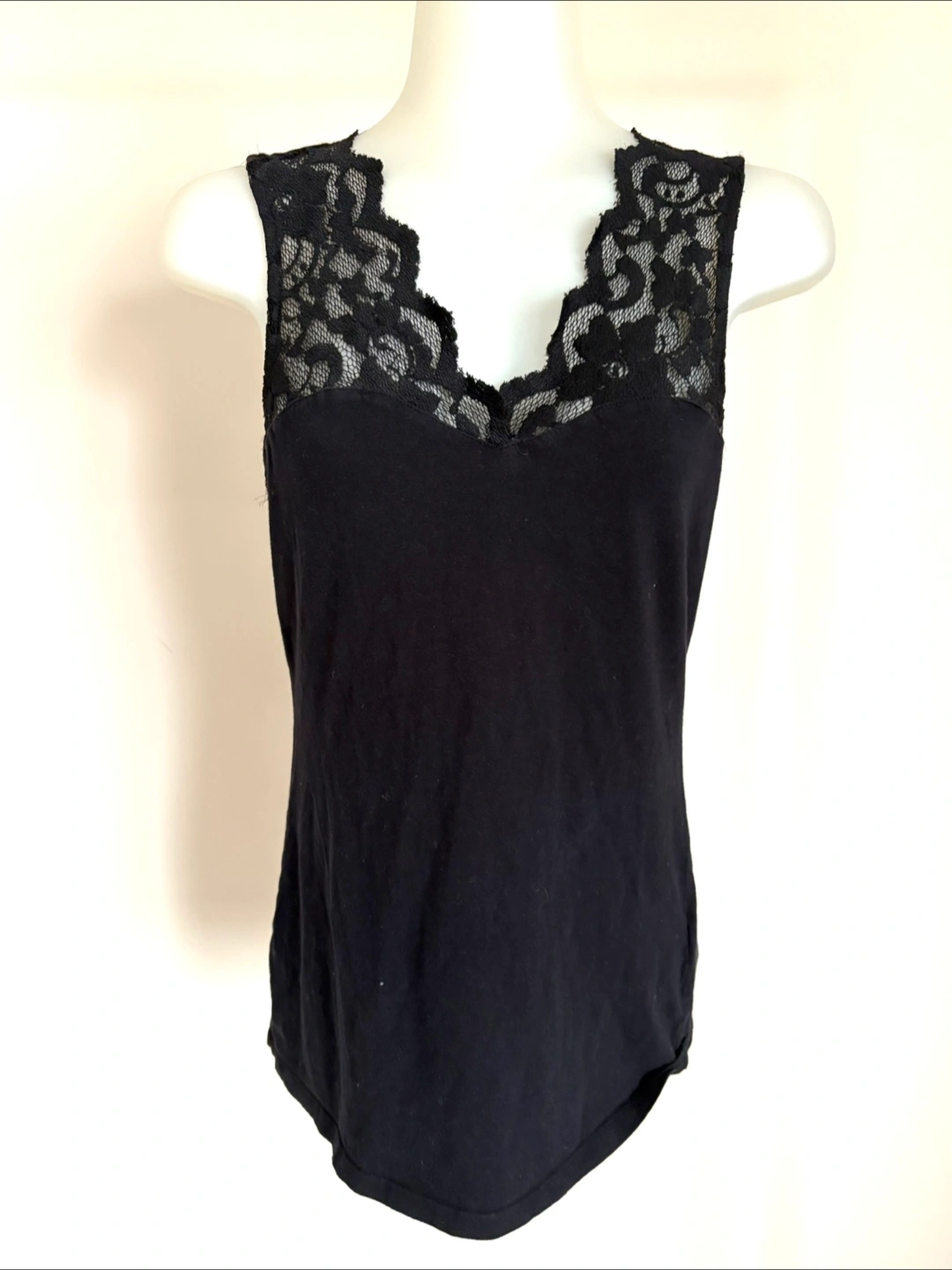 Black tank top from H&M with lace trim at the neckline. Made with a comfortable stretch fabric. Size is small.