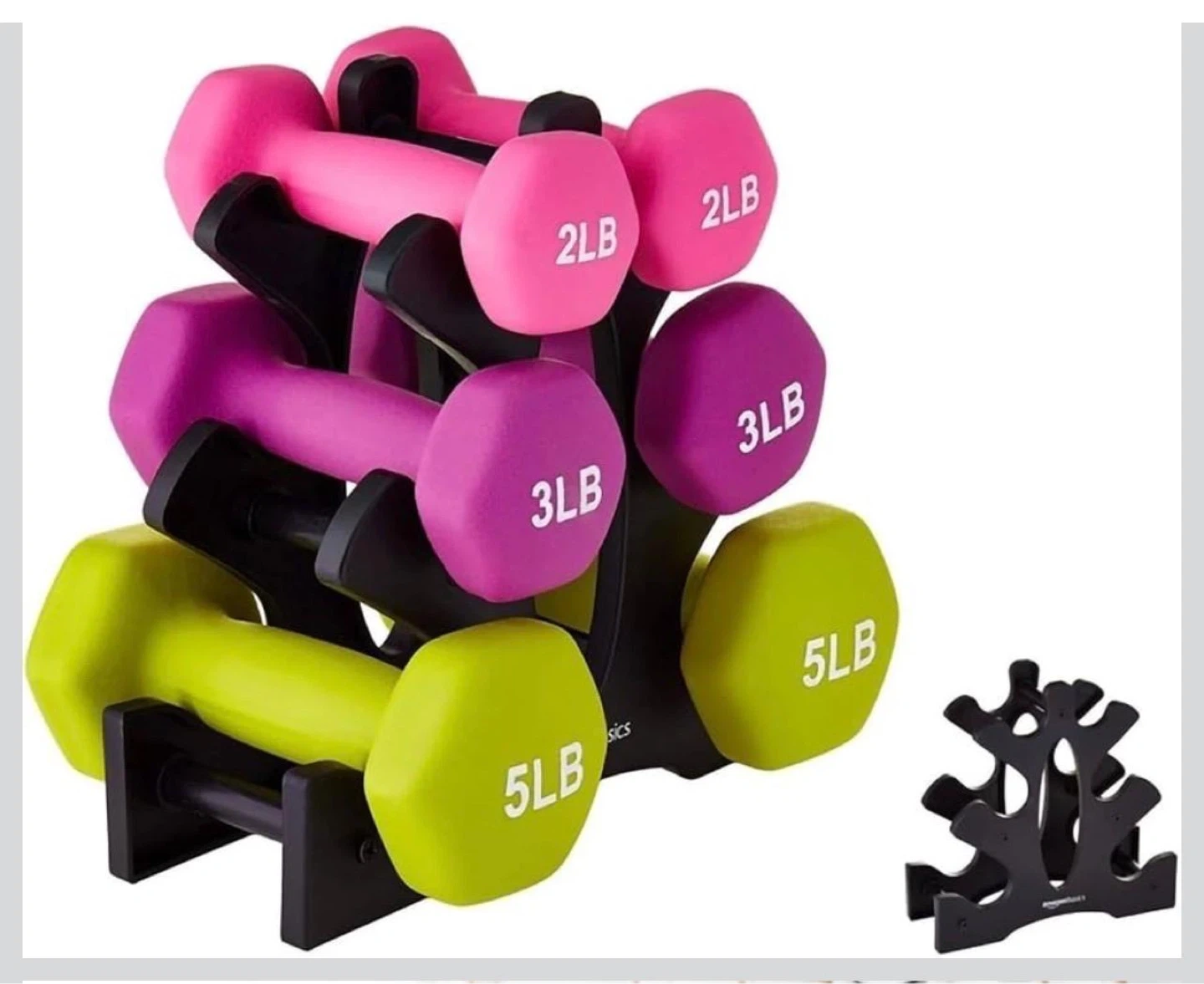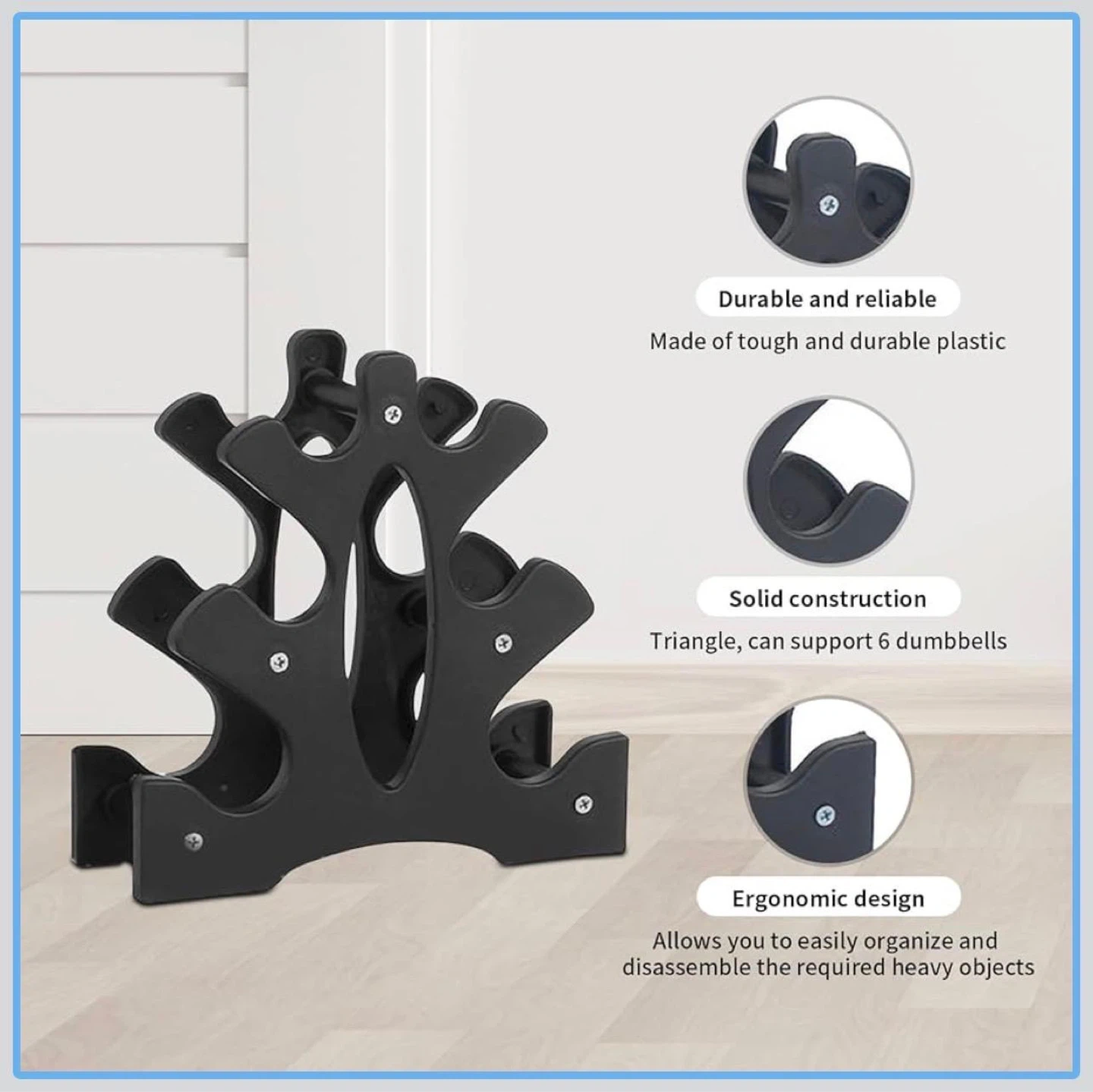 Durable and reliable dumbbell rack. Made of tough and durable plastic. Solid construction, triangle design, can support up to 6 dumbbells. Ergonomic design allows for easy organization and disassembly. Measures 23cm x 8.5cm x 22.5cm.