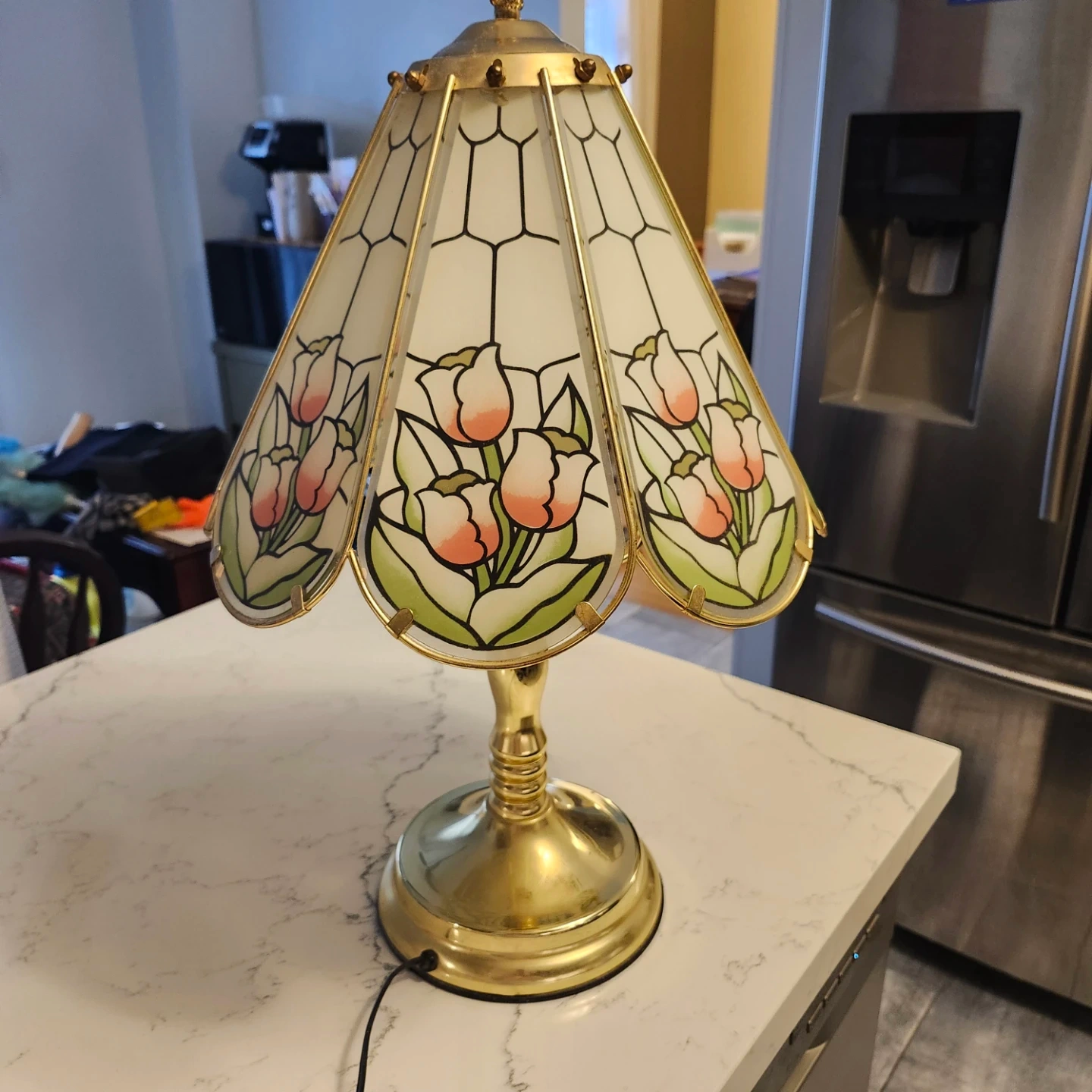 This accent lamp features a stained glass shade with a lovely tulip design. 3 phase touch light. The base is made of polished brass. It's perfect for adding a warm glow to any room.