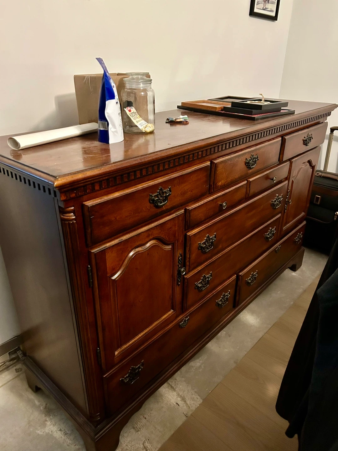 This is a beautiful dark wood dresser with multiple drawers and a cabinet door. It features ornate metal hardware on all the drawers and the door. The wood has a rich, polished finish. It's a solid piece of furniture. Contact me at 250 588 2811