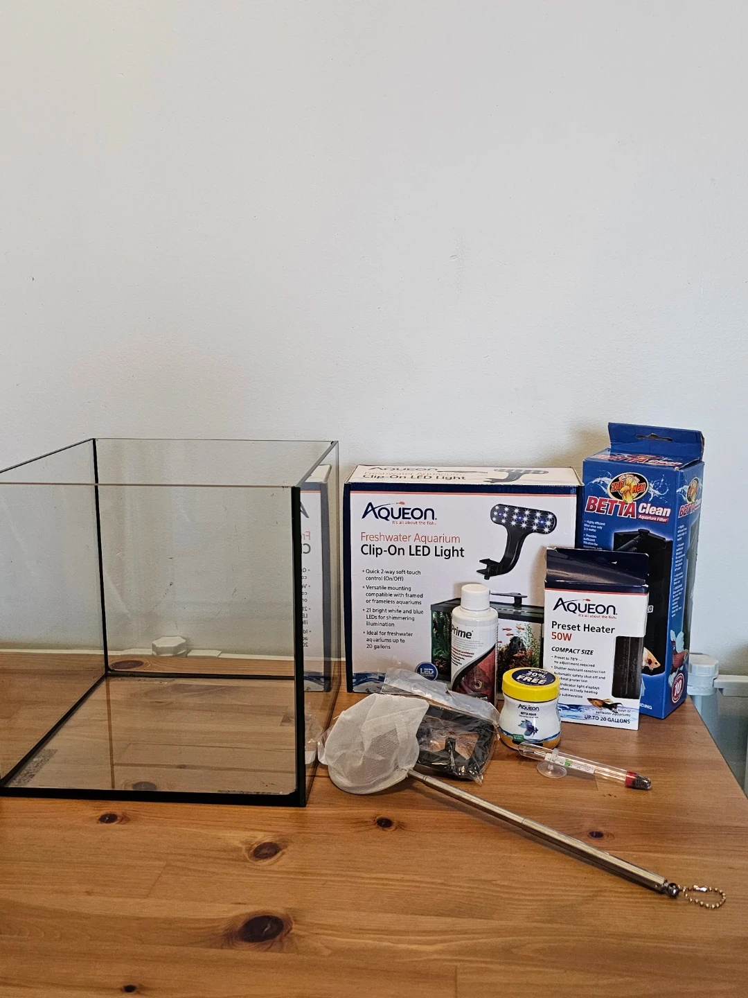 Selling this seapora 5 gallon Aquarium (1OxlOxl0 in) along with a corner Beta Clean filter, Aqueon LED light, Aqueon heater, Prime water conditioner, Aqueon Betta food and Accessories