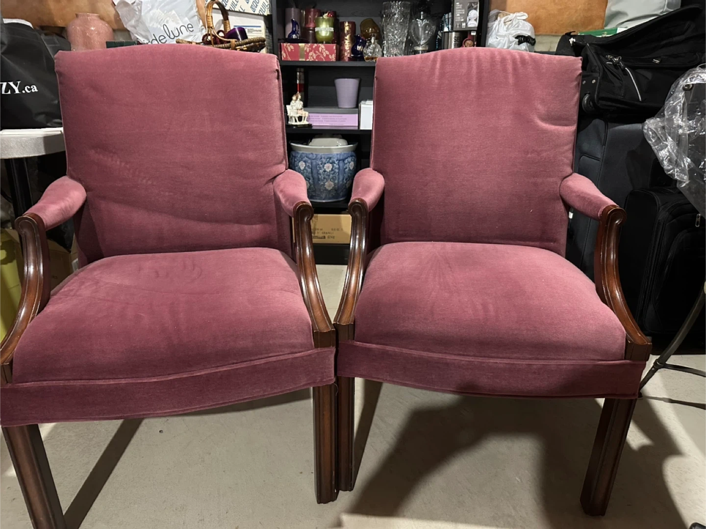 Selling a pair of armchairs with a lovely burgundy velvet upholstery! They feature elegant, curved wooden arms and sturdy legs. These chairs would be a great addition to any living room or study.
