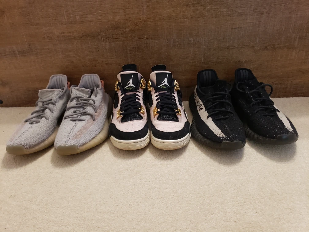 These are 3 shoes at the price of 200. The first two are yeezy 350 the retail on both of them is 220 each but I'm selling them both and another shoe for the price of 200 so its a good deal the third shoe is an air jordon 4. theese shoes are slightly used. Beware that I don't have the box for them because I got them 2 months ago, thanks