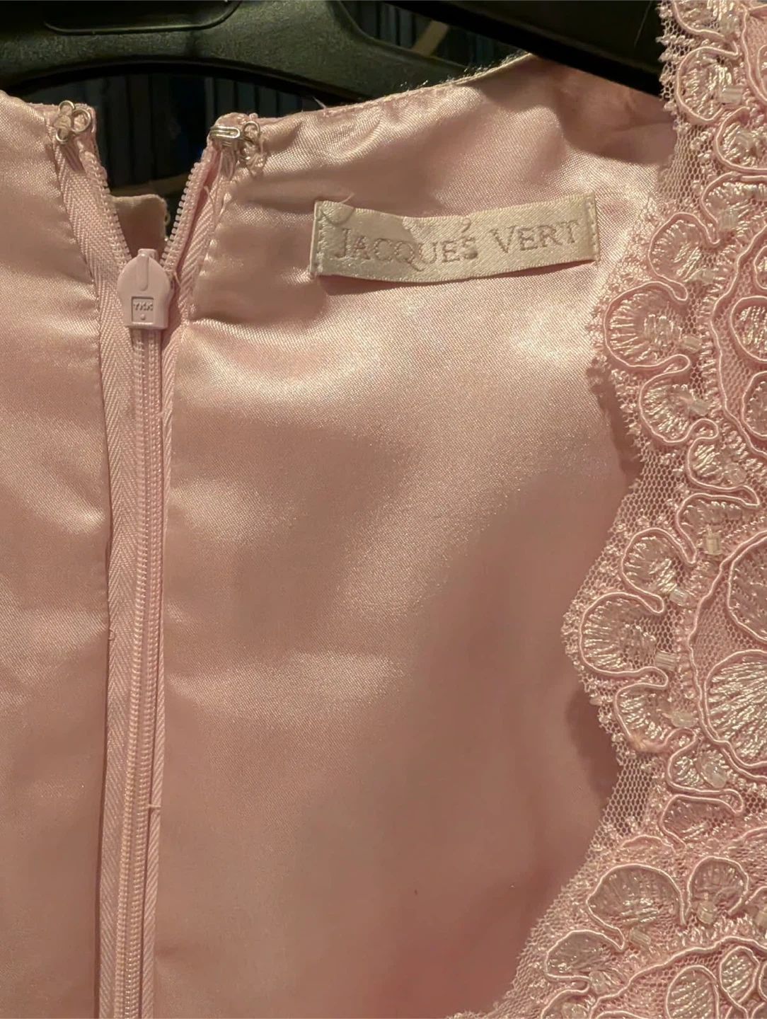 This Jacques Vert dress features delicate lace overlay and a satin lining. It has short sleeves and a satin belt with a bow accent at the back. Perfect for a special occasion!