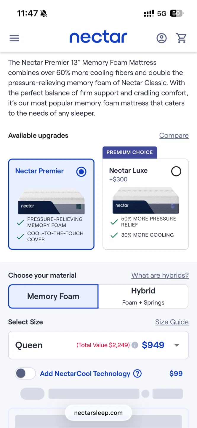 This is a Nectar Premier Queen mattress. It's made with memory foam and cooling fibers. The mattress is designed for comfort and support.