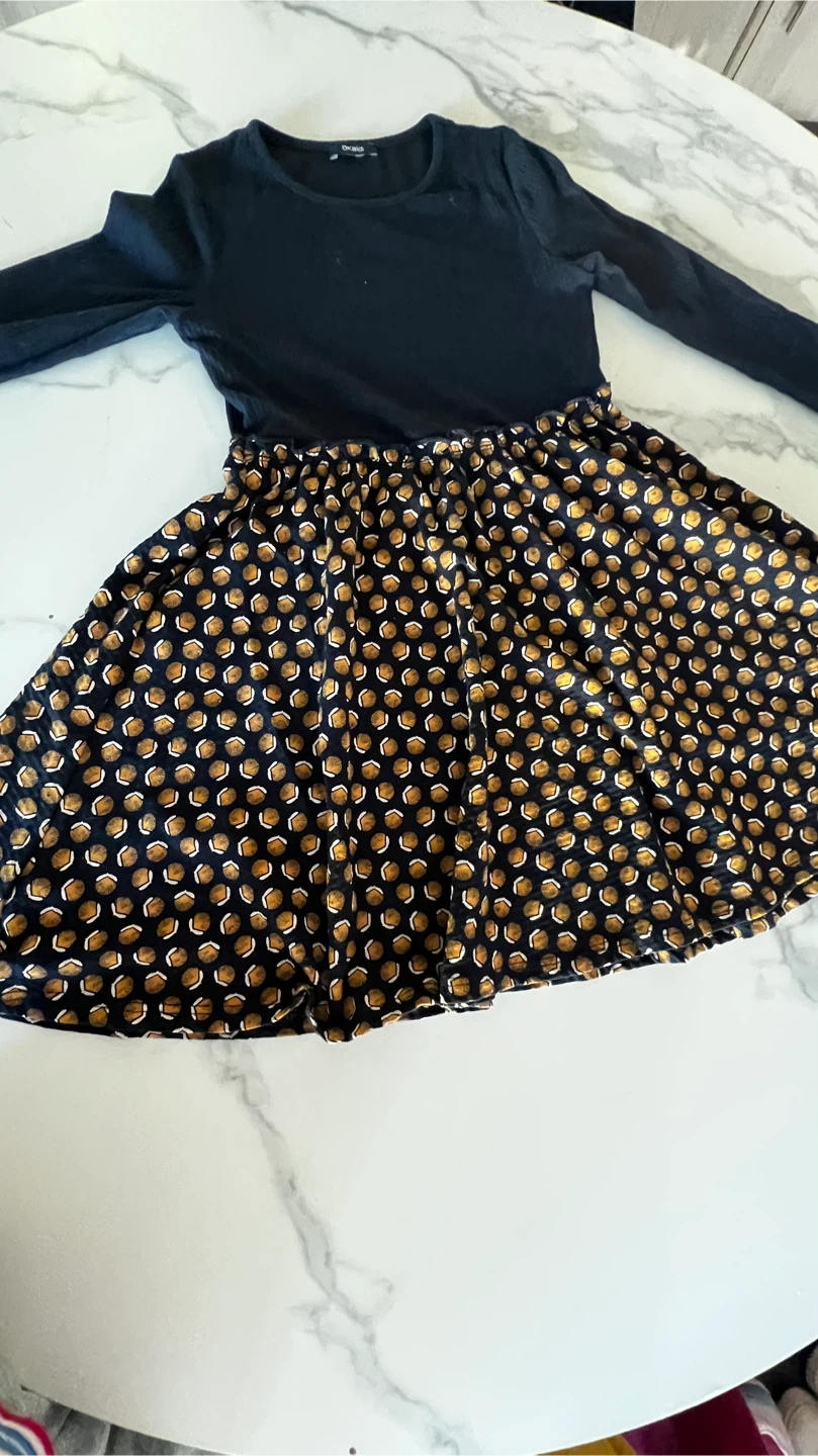Cute Okaidi dress for girls. It's a size 10A/Y, which is equivalent to 140cm. The top is solid navy, and the skirt features a fun all-over print. Perfect for playtime!
