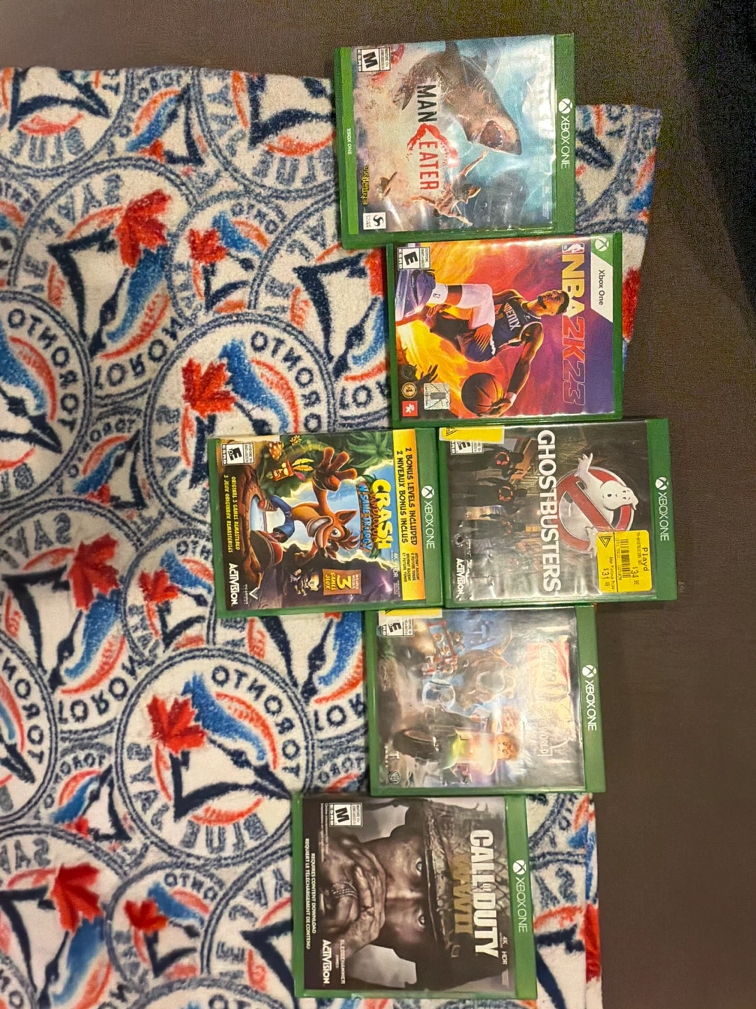 Bundle includes Man Eater, NBA 2K23, Crash Bandicoot N. Sane Trilogy, Ghostbusters, and two other Xbox One games. All games are in their original cases. Perfect for any gamer looking to expand their Xbox One library!