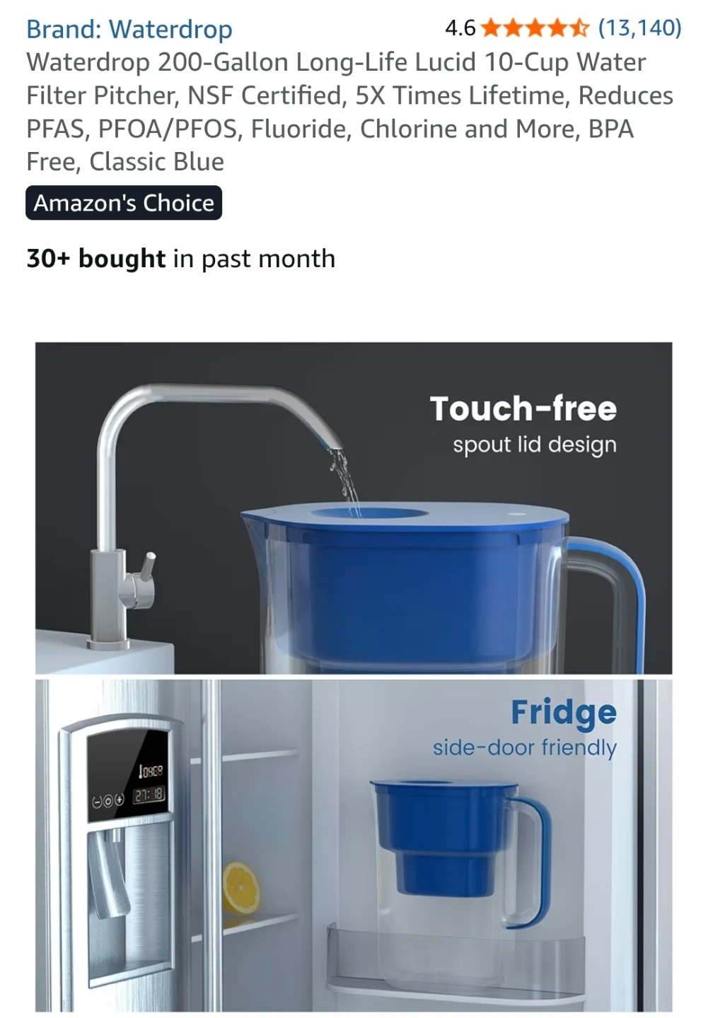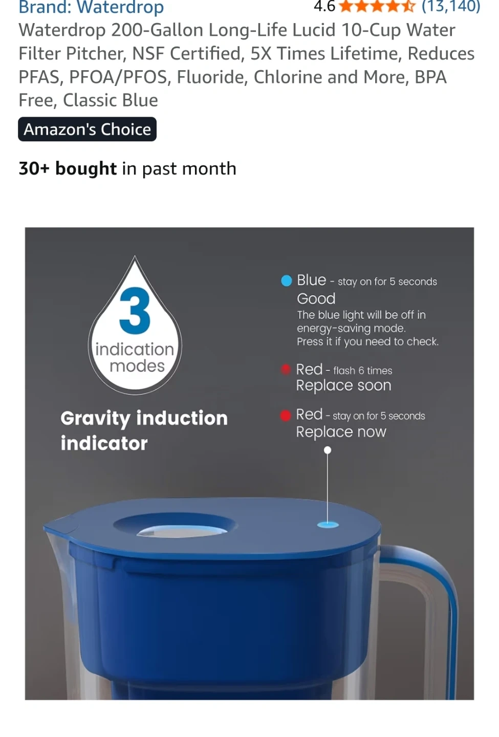 It's NSF certified for reducing contaminants. The pitcher has a clear body with a blue lid and handle.