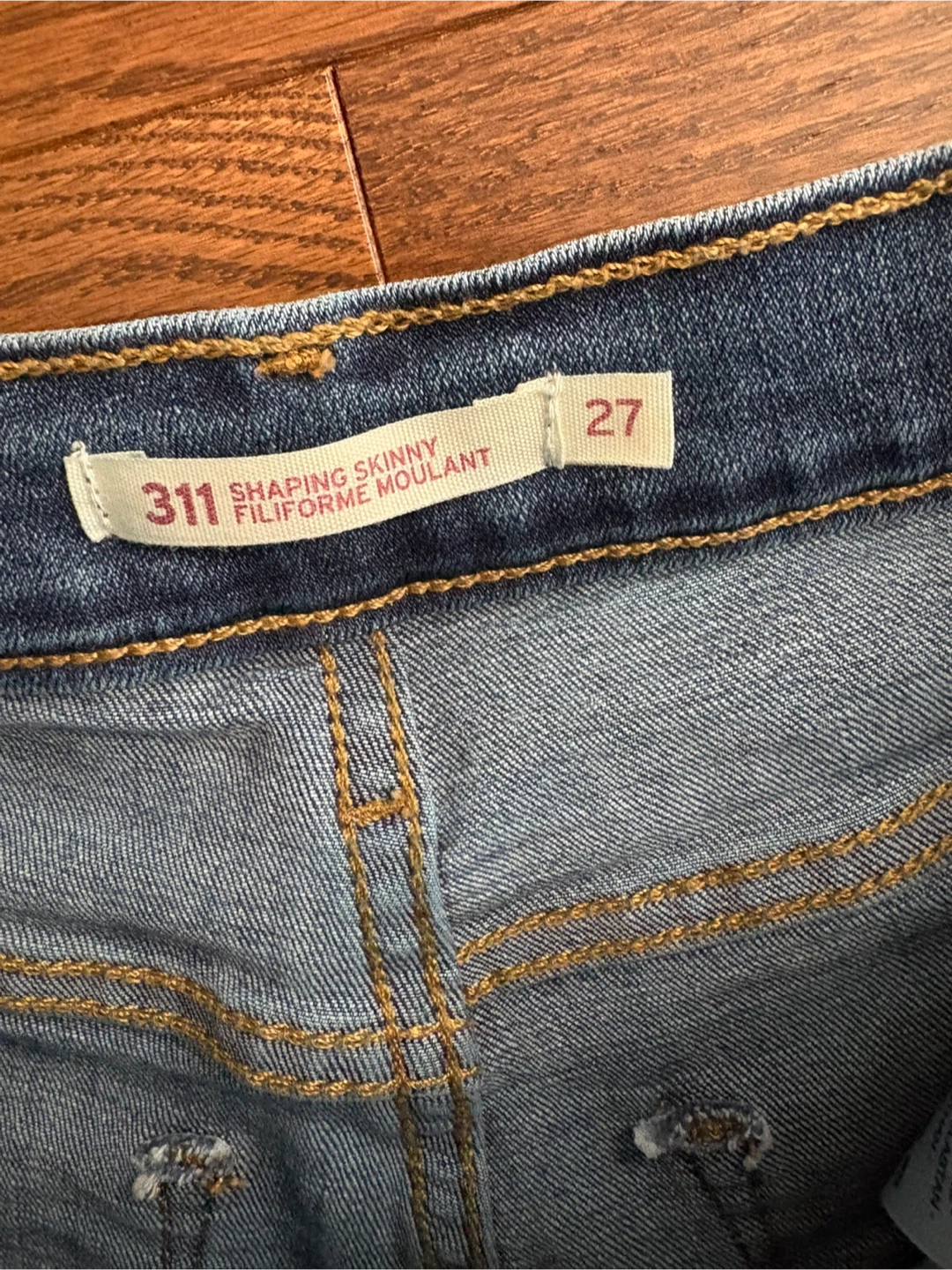 These are a pair of Levi's 311 Shaping Skinny jeans in a size 27. They're a blue denim wash. Made from a comfortable stretch fabric.