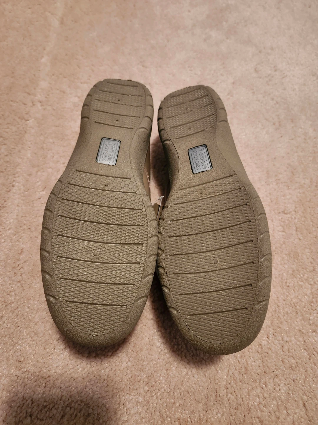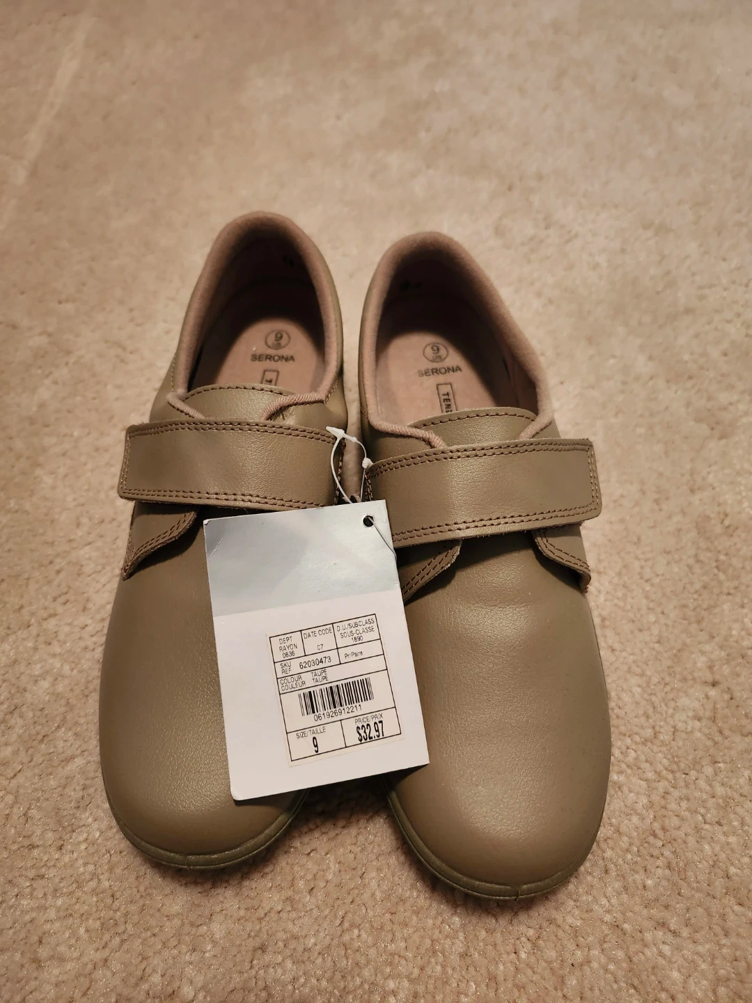Slip-resistant and washable leather upper. These shoes are a size 9 and come in a taupe colour. They feature adjustable hook-and-loop straps for an easy fit. New condition!