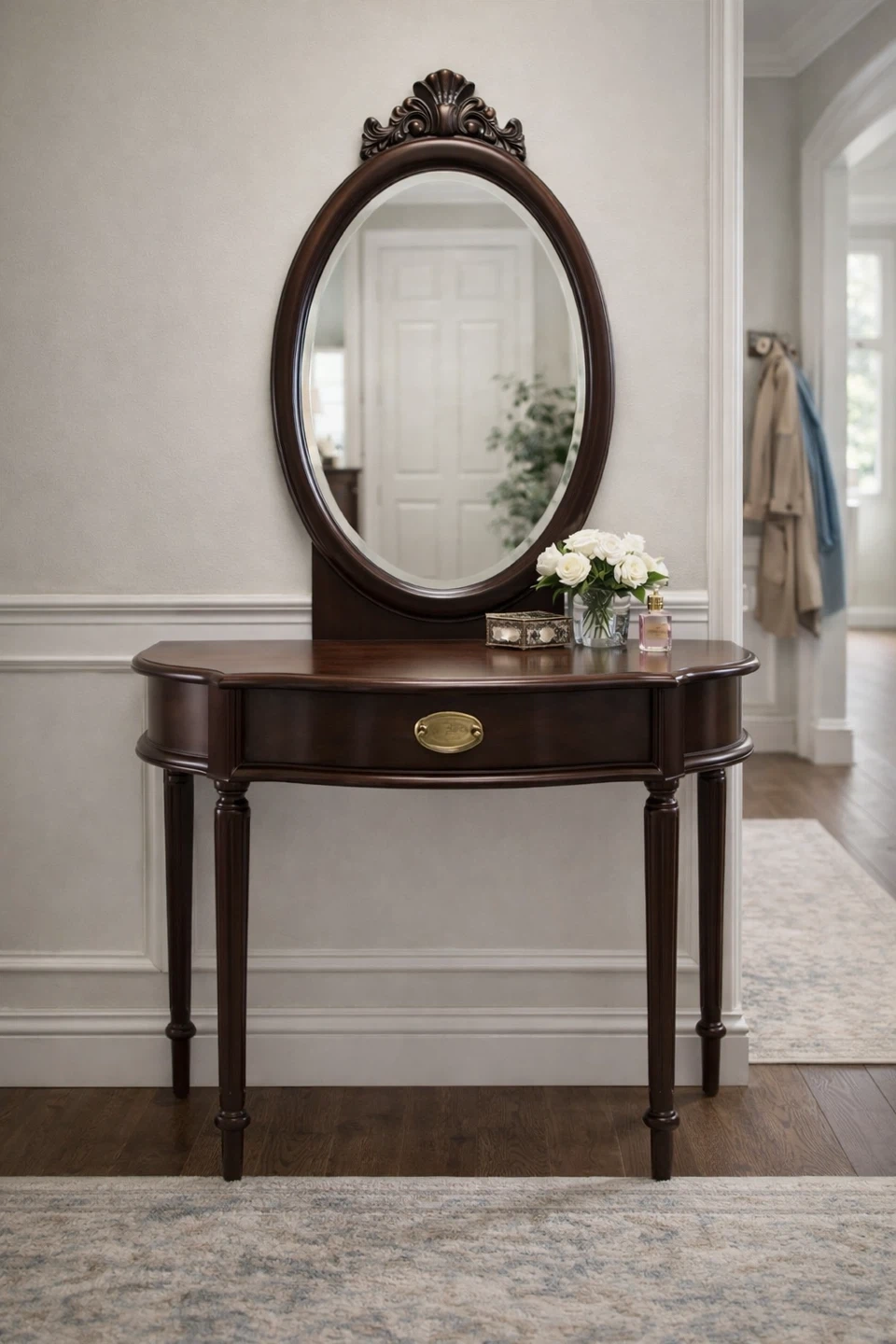 This elegant console table features a rich dark wood finish and an oval mirror with decorative detailing. It includes a single drawer with a brass pull for convenient storage. The table's legs have a classic turned design.