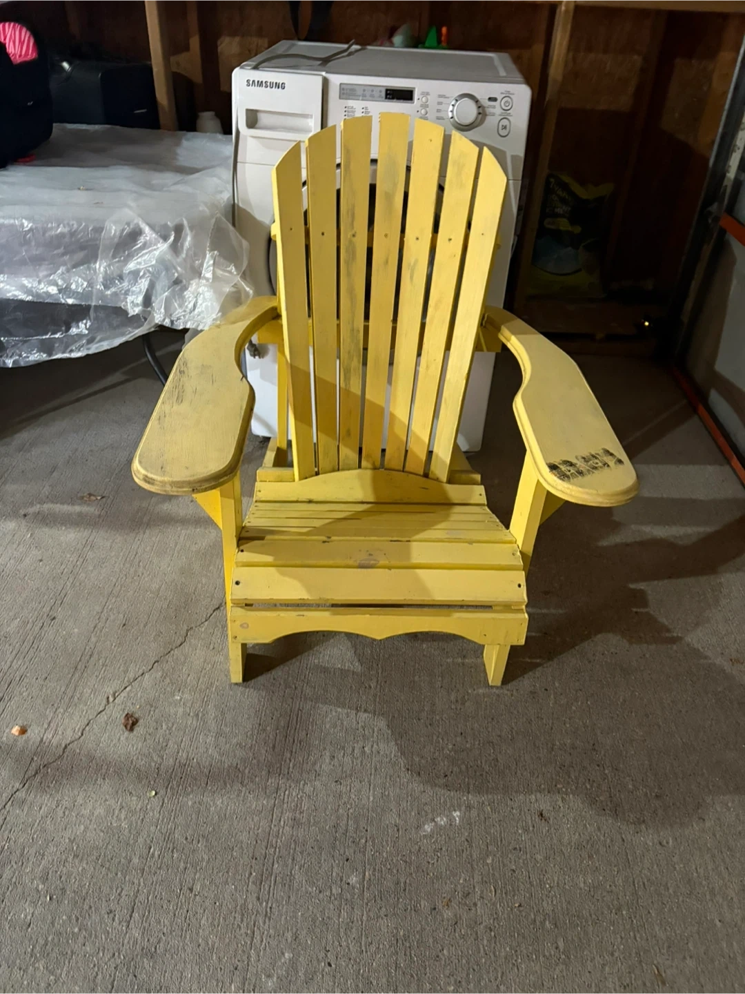 65Selling a sunny yellow Adirondack chair! It's perfect for relaxing in your backyard or on the patio. This chair is super comfy and adds a pop of colour to any outdoor space. It has some signs of wear.