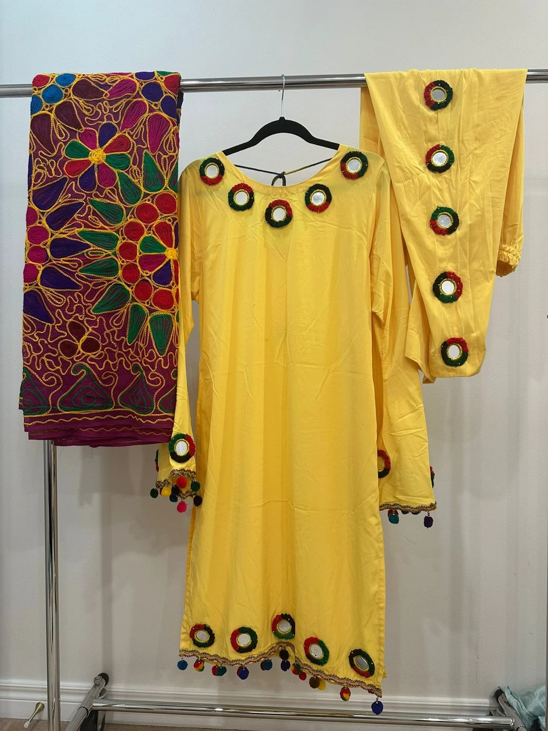 10Selling a beautiful yellow 3-piece suit with colourful embroidery and mirror detailing. It includes a long shirt, pants, and a dupatta. Perfect for a special occasion!
