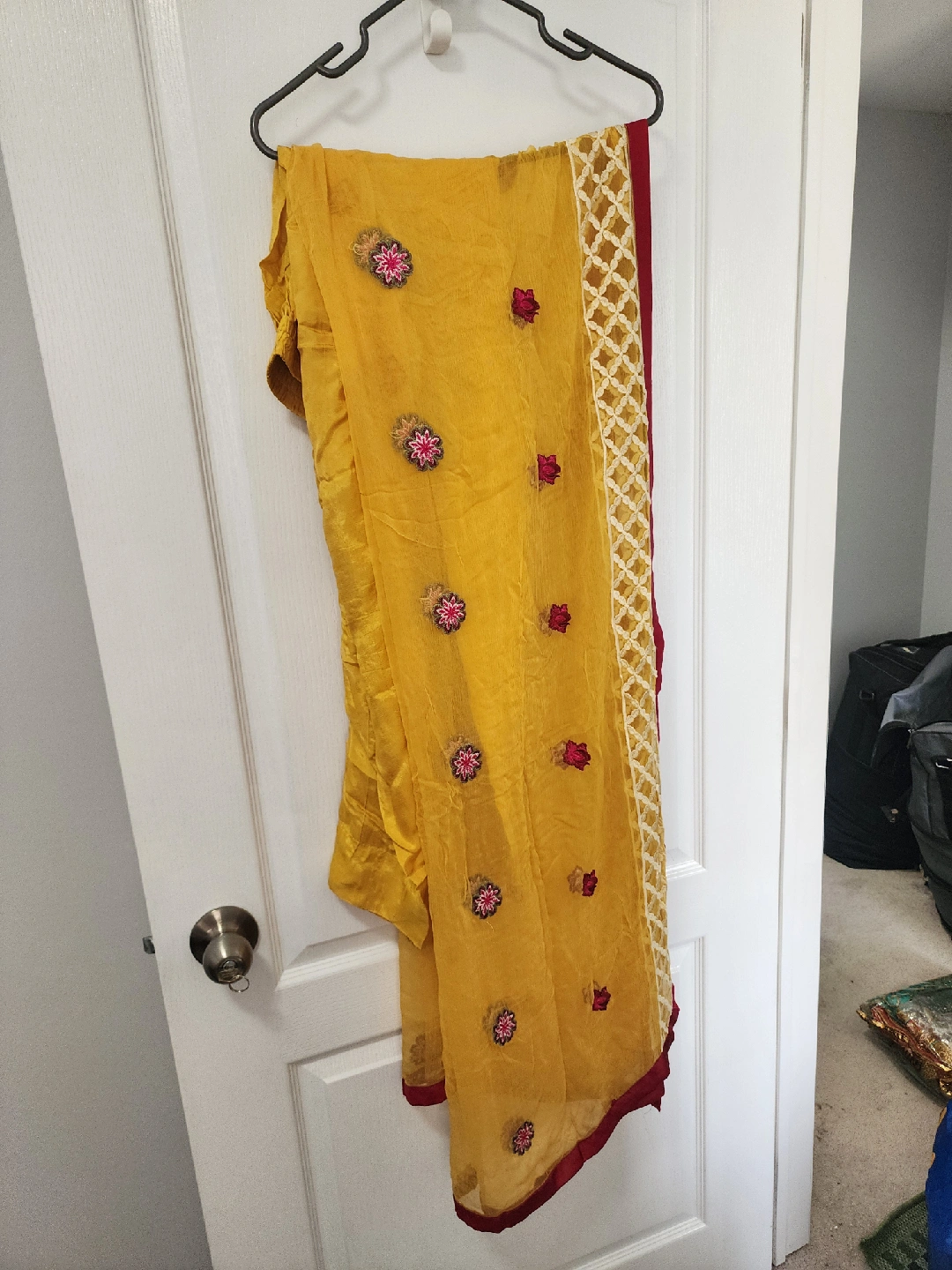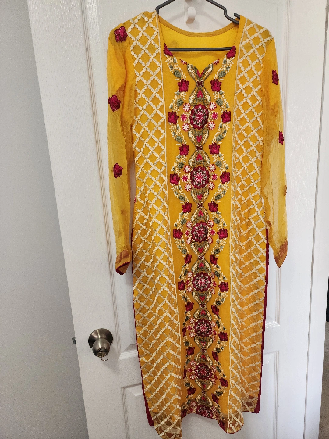Beautiful yellow salwar kameez with intricate embroidery! The set includes the kameez (top), salwar (pants), and dupatta (scarf). Perfect for a special occasion or festive event