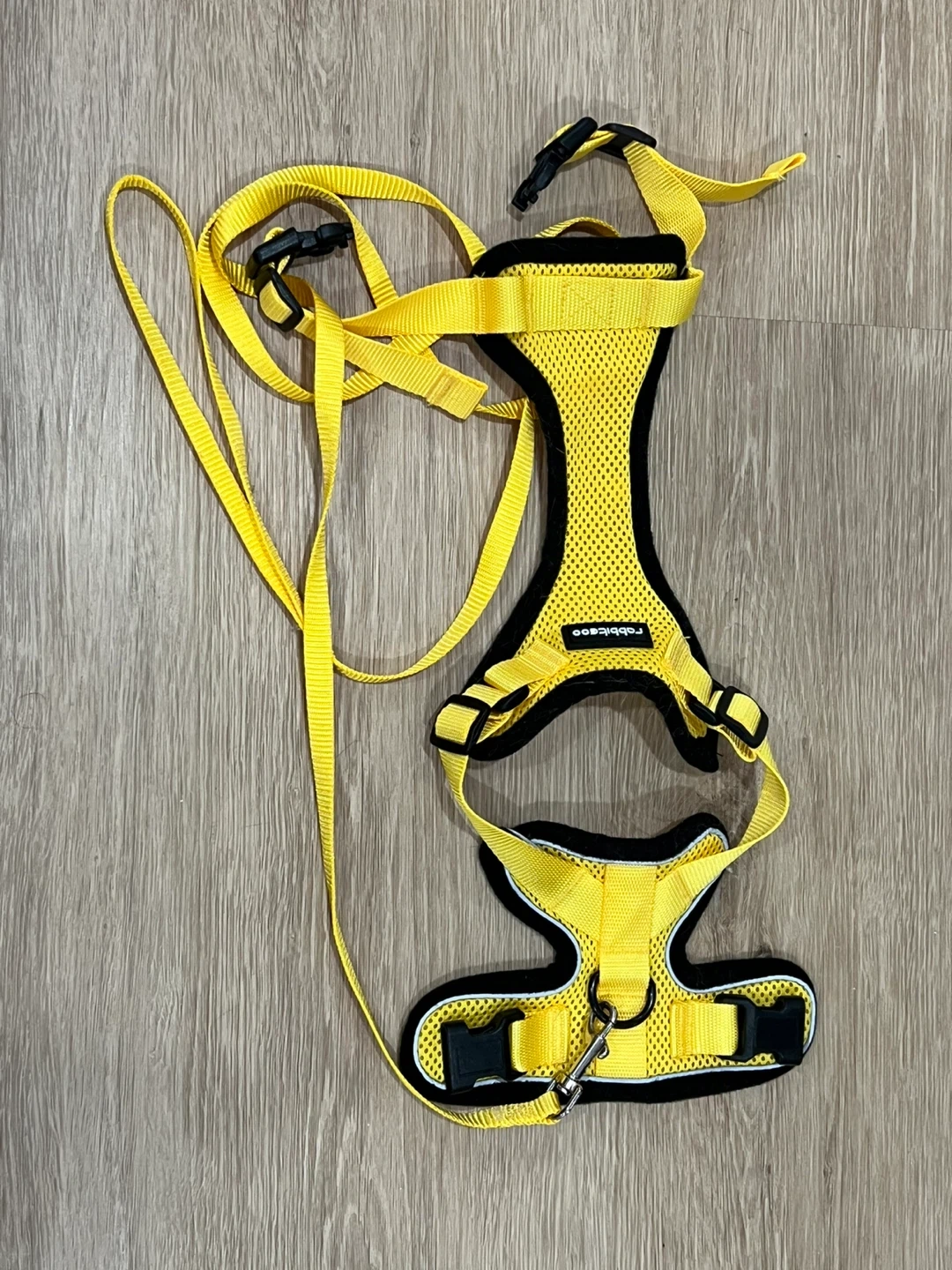 205Selling a yellow dog/ cat harness in size small. It's in great shape and ready for your furry friend! The harness features black accents and a comfortable, breathable mesh design.