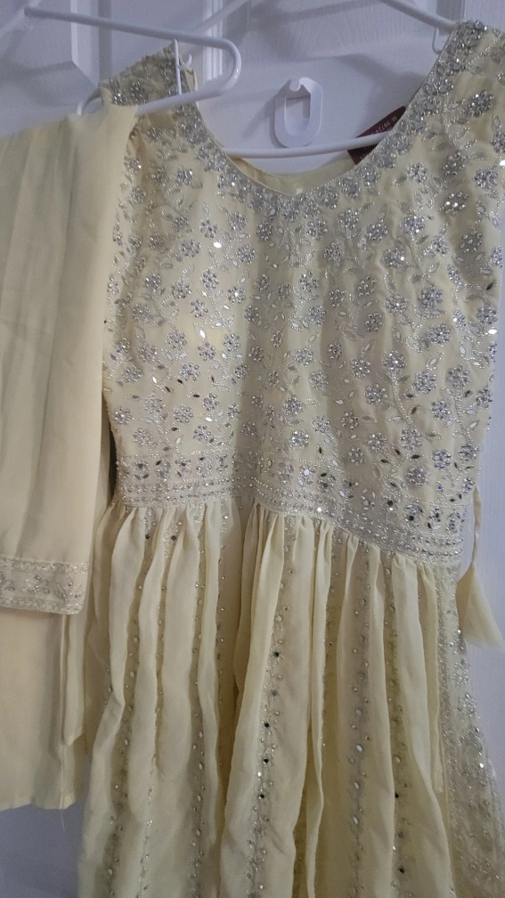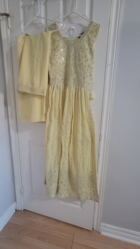 10Selling a beautiful yellow plazzo suit. It's in great condition and features delicate embellishments. Perfect for a special occasion or a festive gathering!