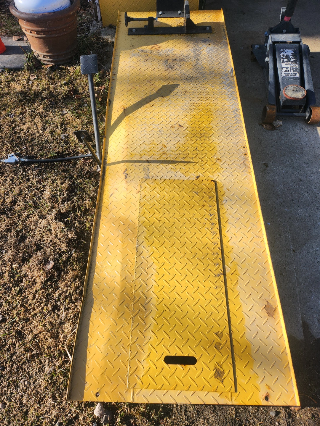 10Heavy-duty steel motorcycle service ramp. Features diamond plate surface. Shows some wear from use. Includes foot pedal.