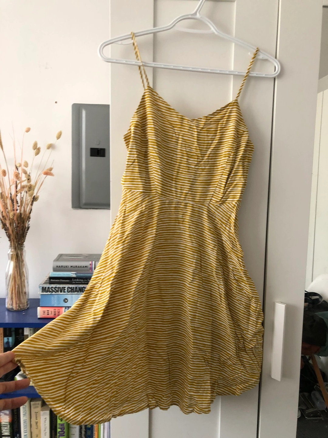 Dark yellow and white striped sleeveless summer dress. Very cute and flowy. Xs but could fit bigger. The back is elasticized so it stretches