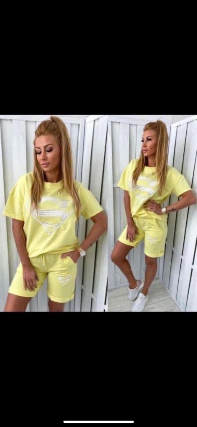 Cute yellow matching set with a Superman logo design! The set includes a short-sleeved t-shirt and shorts. Perfect for casual wear or lounging around at home