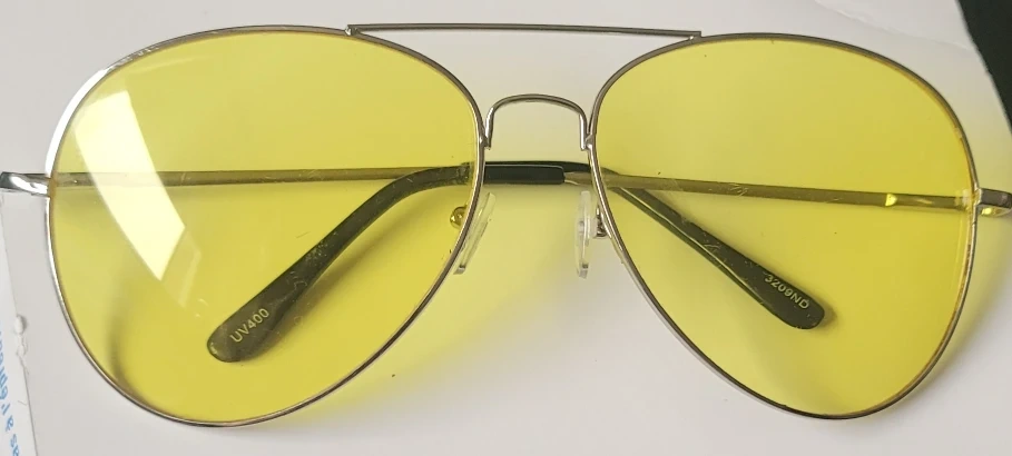 Selling a pair of aviator sunglasses with yellow tinted lenses. They have a silver frame and UV400 protection. The model number is 3209ND. They're in great shape!