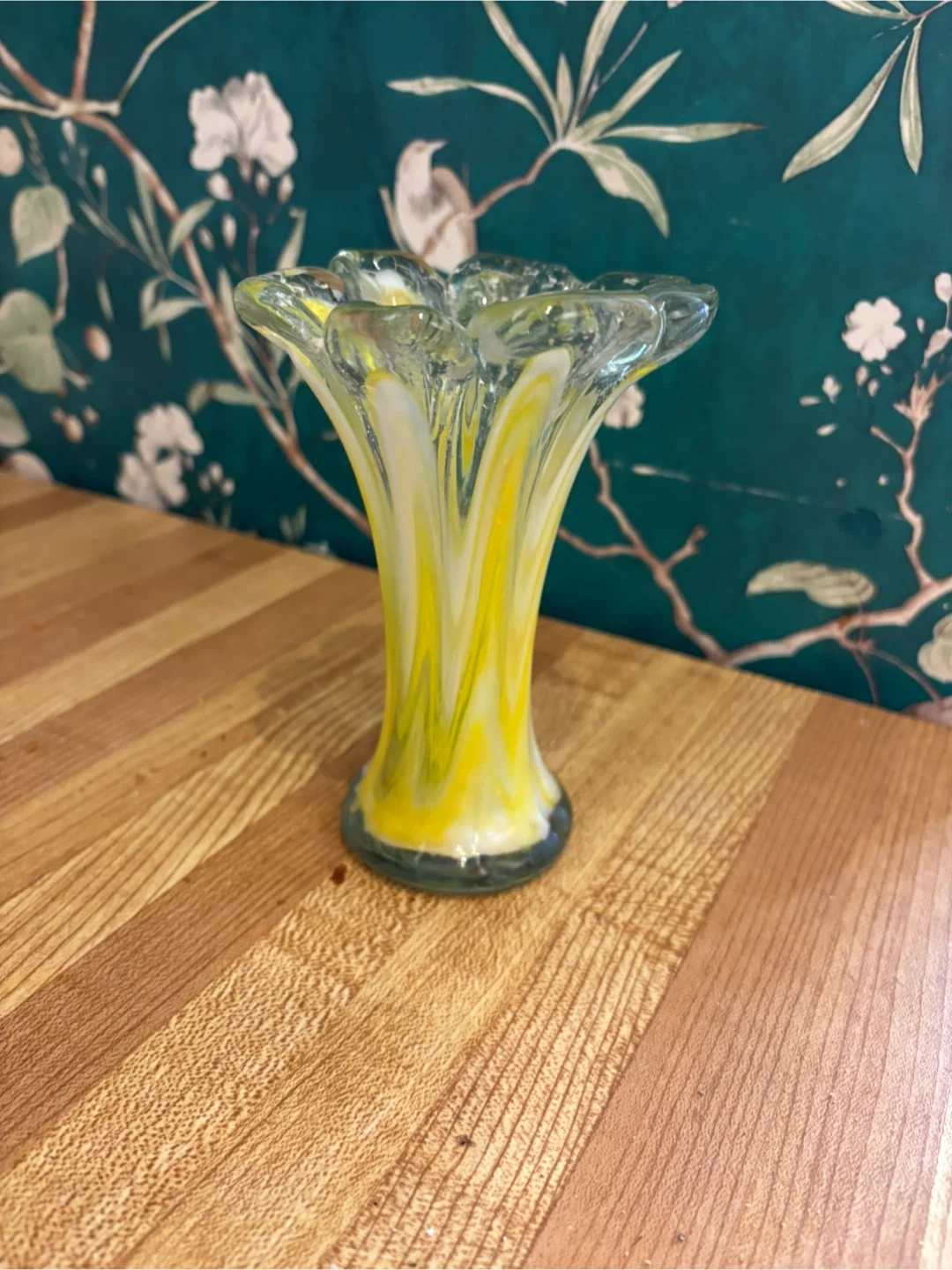 Here's a lovely small glass vase with a yellow and white swirl pattern! It's in great condition and would look beautiful with flowers or as a decorative piece on its own