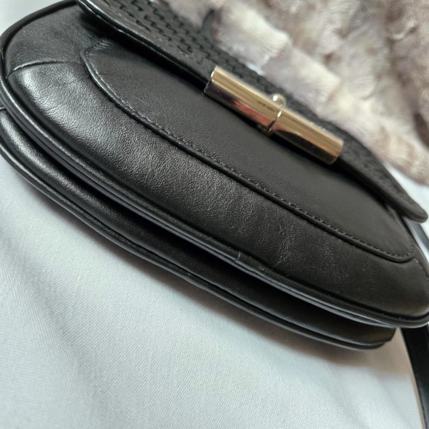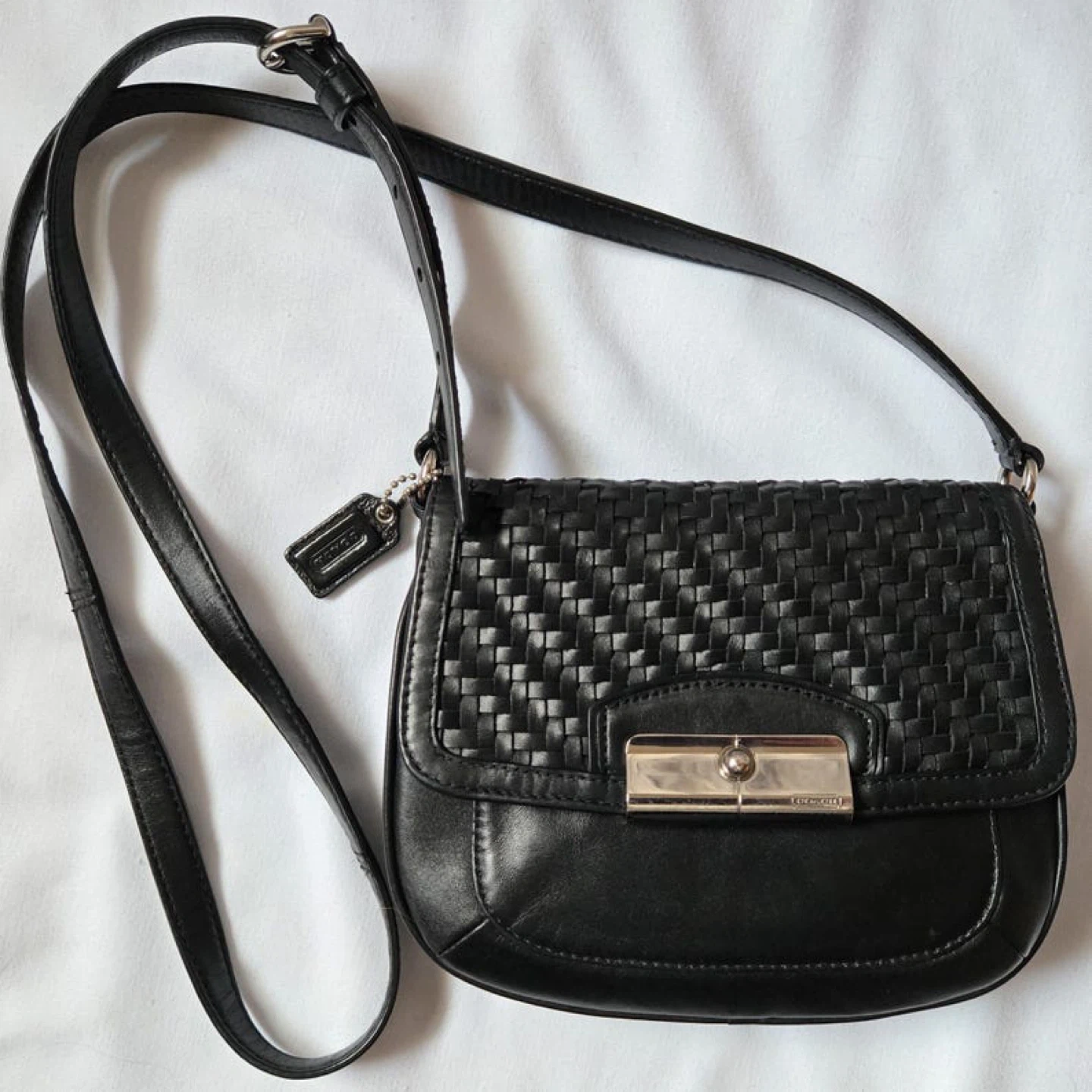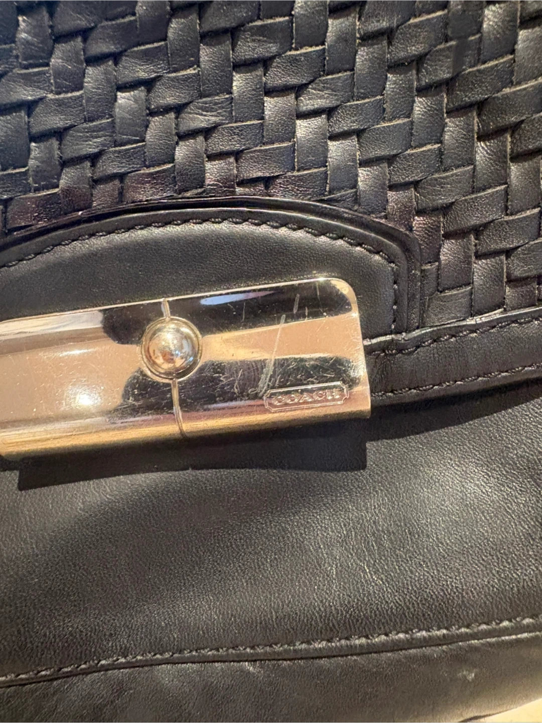 This vintage Y2K Coach shoulder bag is made of black leather with a woven front detail and a silver turn-lock closure.