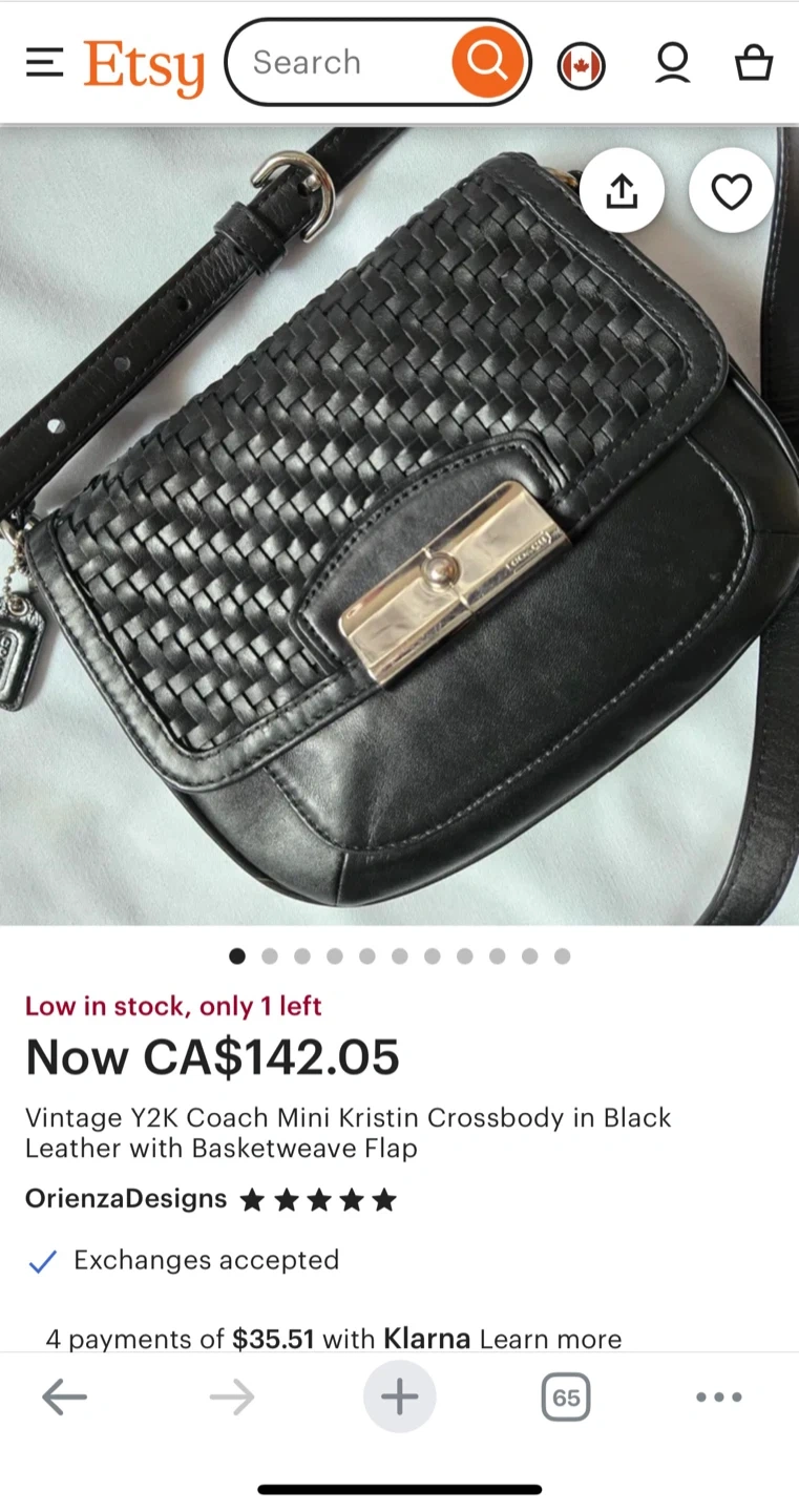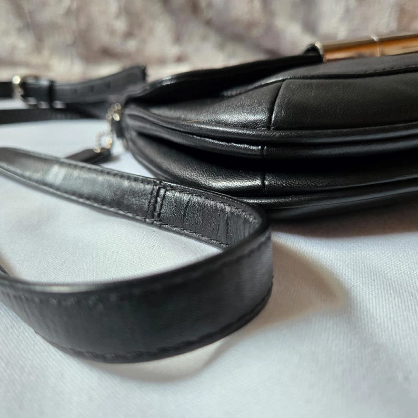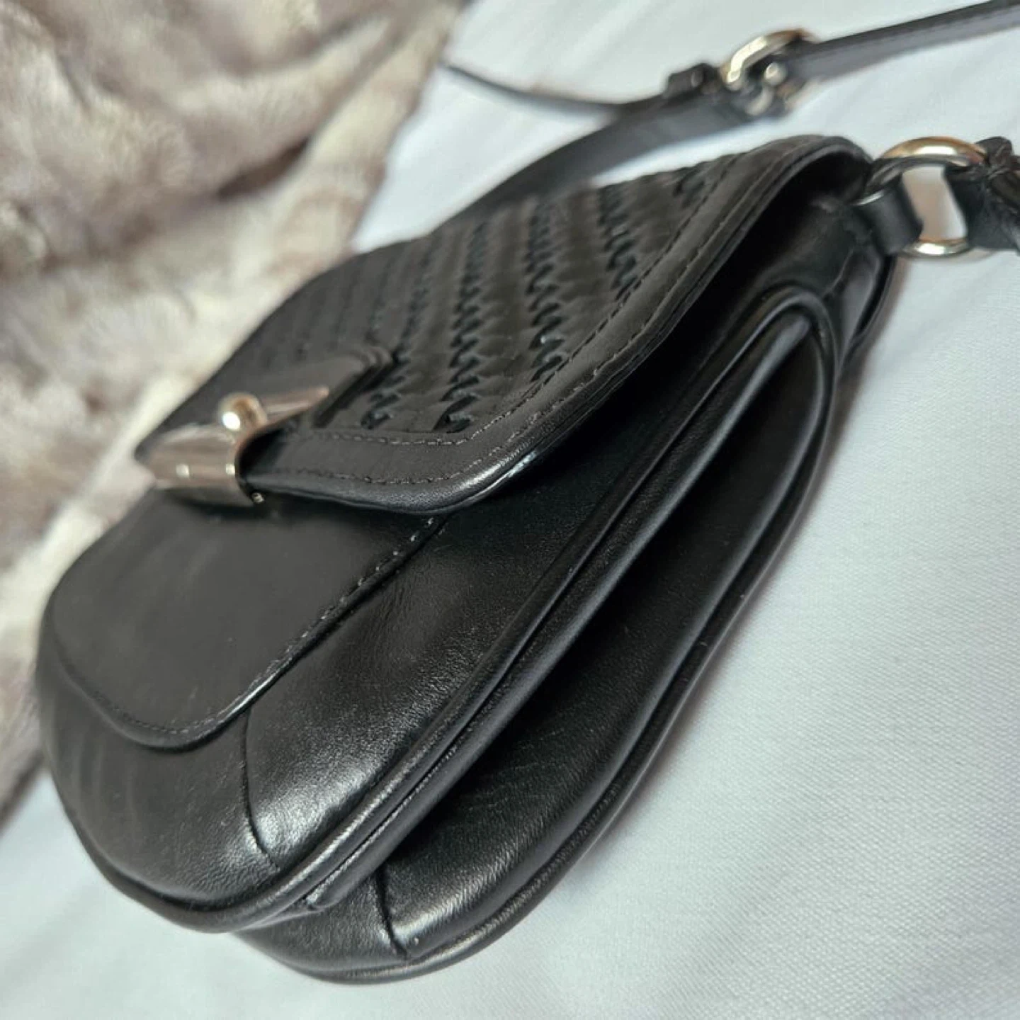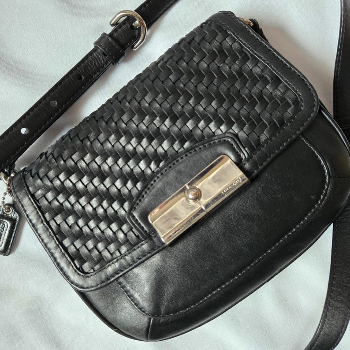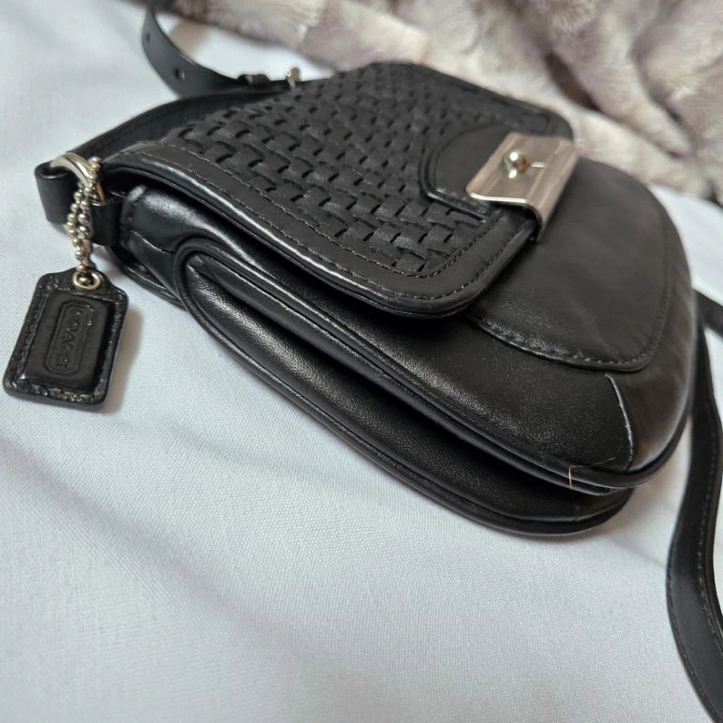 This vintage Y2K Coach shoulder bag is made of black leather with a woven front detail and a silver turn-lock closure.