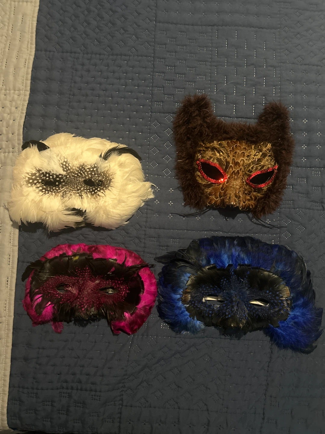 Selling a unique feather masquerade masks! Each mask has a different color and design, perfect for parties or decorations.