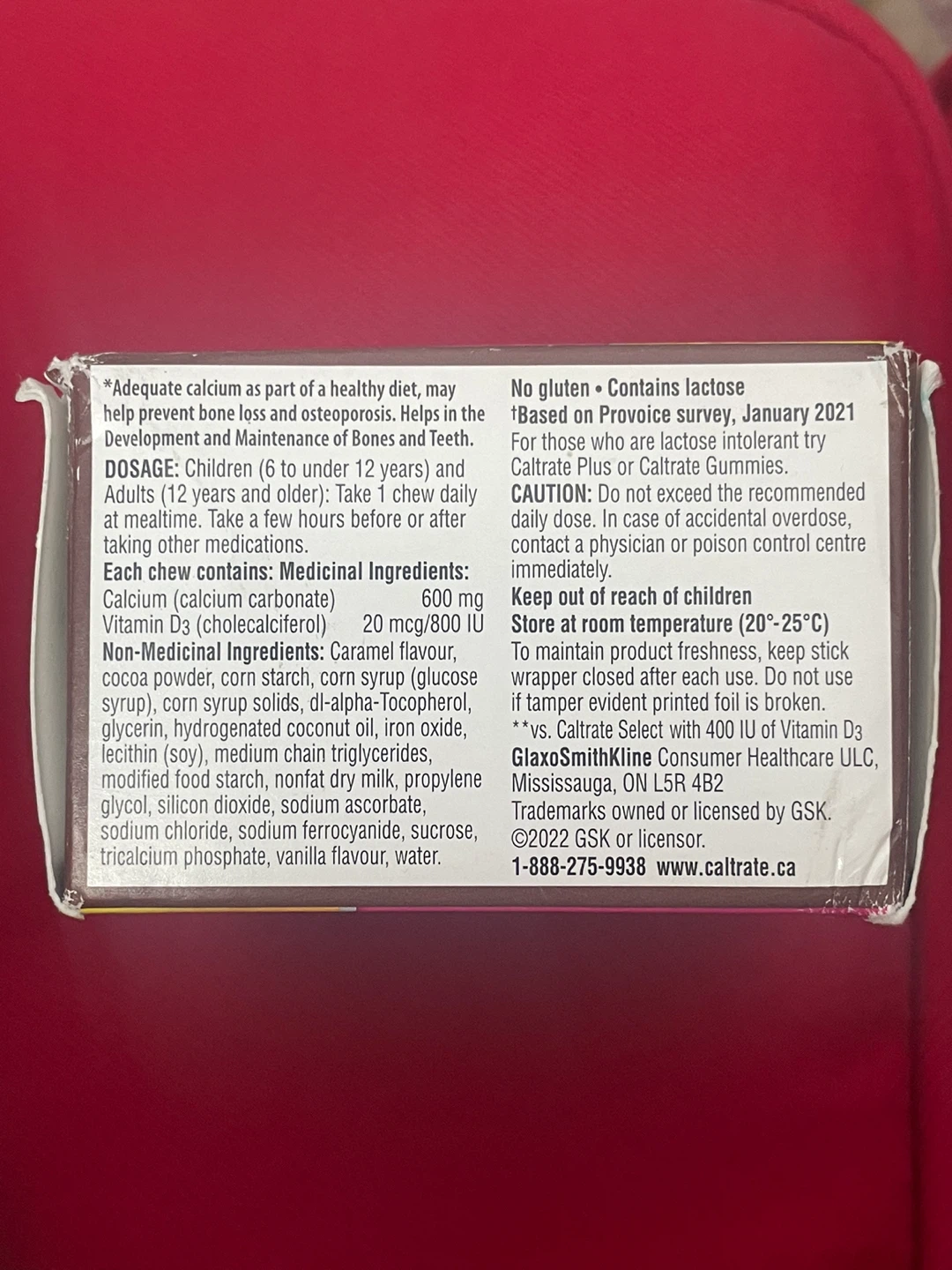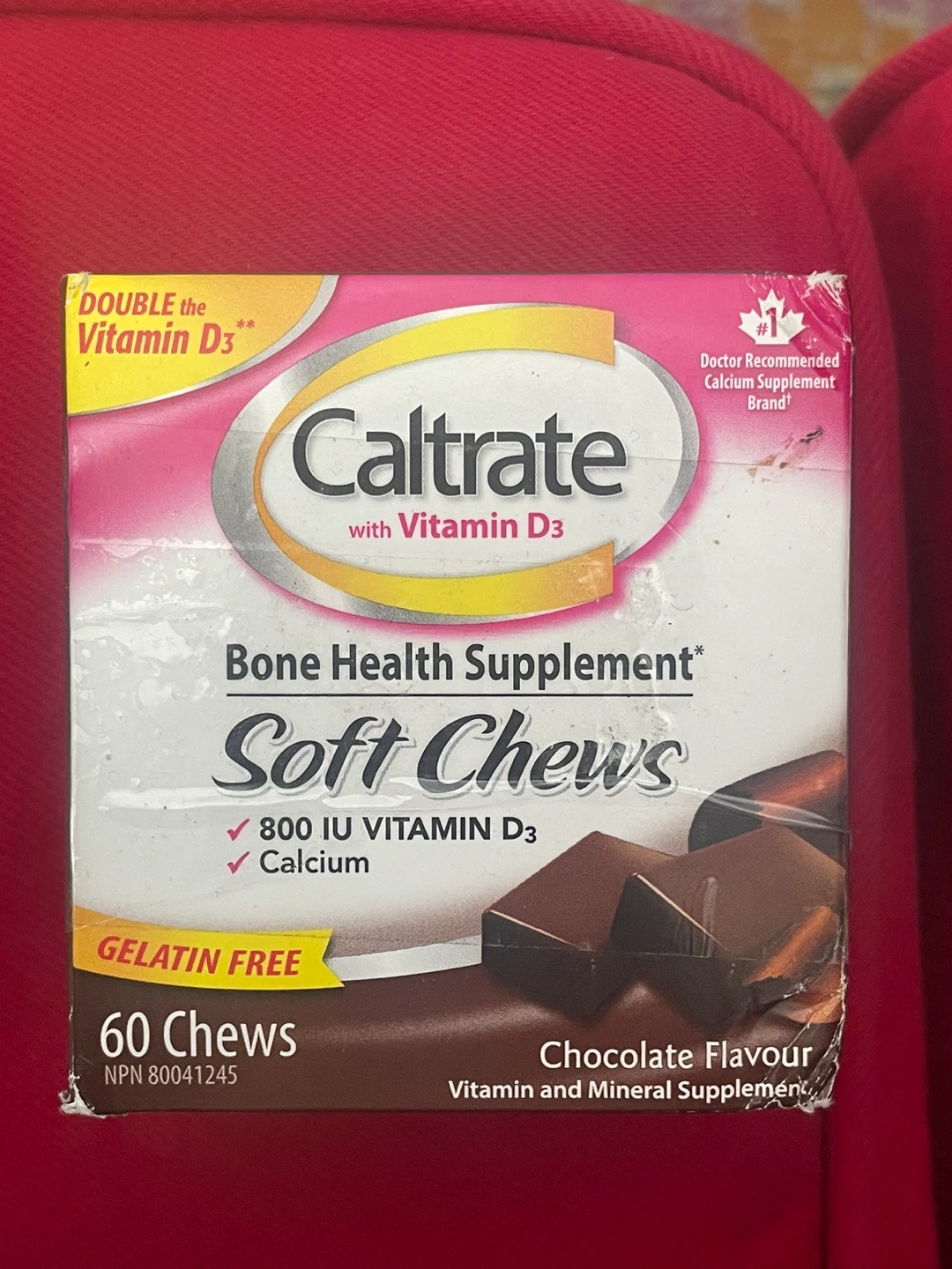 Selling a box of Caltrate Soft Chews with Vitamin D3 in Chocolate flavour. These are gelatin-free and come with 60 chews. Expiry date is May 2027. Perfect for maintaining healthy bones and teeth!
