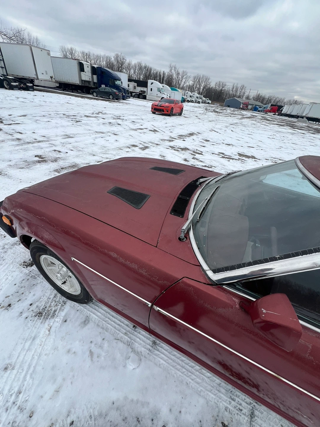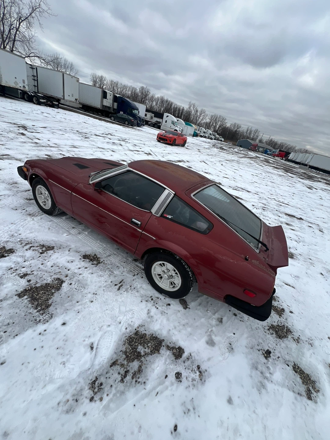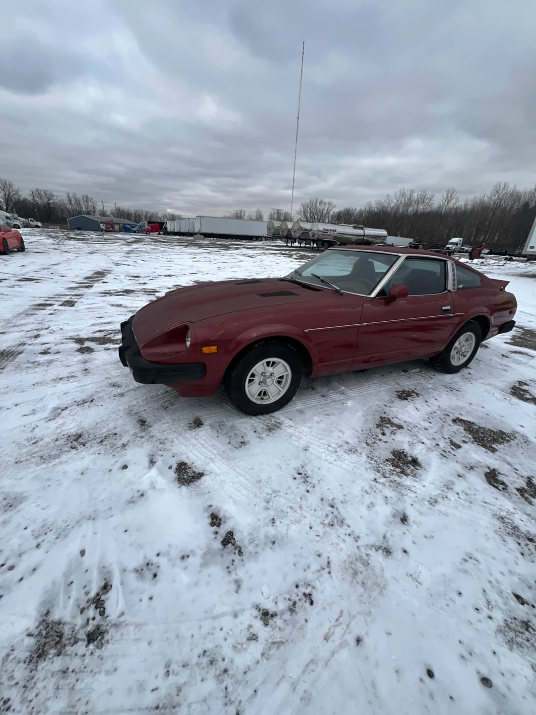 This is a 1979 Datsun 280ZX. It's a classic sports coupe in a deep red color. This car would be a great project for a collector or enthusiast.