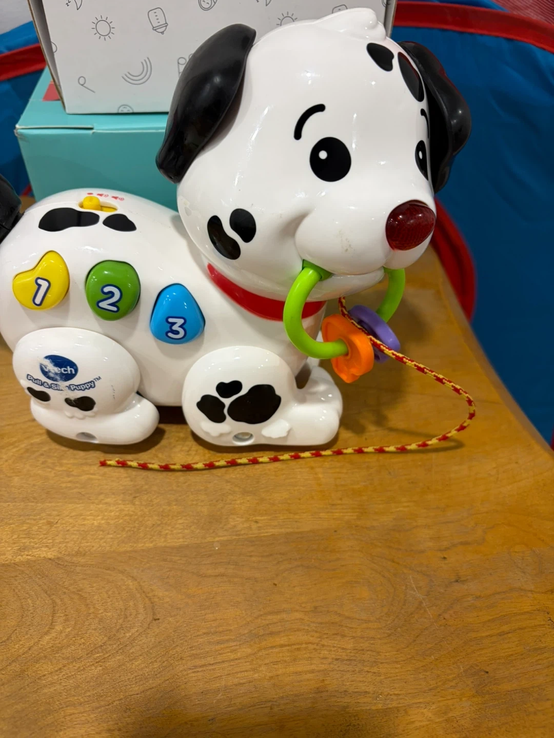 This VTech Pull & Sing Puppy teaches numbers and colours. It's a playful electronic toy for little ones. The puppy has colourful buttons with numbers 1, 2, and 3.