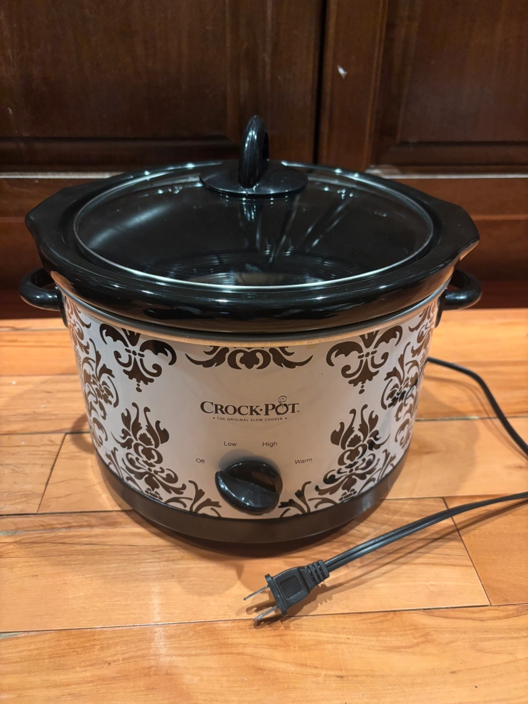 Selling a Crock-Pot slow cooker. It features a black and white floral design. The cooker has settings for off, low, high, and warm. It comes with a glass lid and a removable black ceramic insert.
