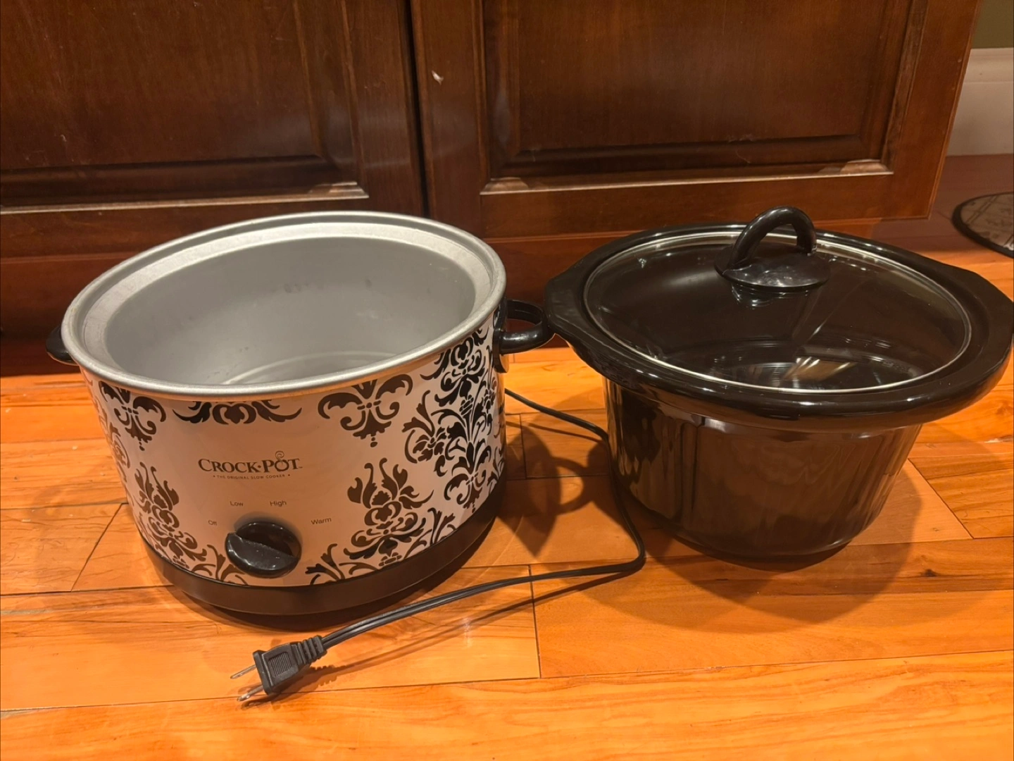 Selling a Crock-Pot slow cooker. It features a black and white floral design. The cooker has settings for off, low, high, and warm. It comes with a glass lid and a removable black ceramic insert.