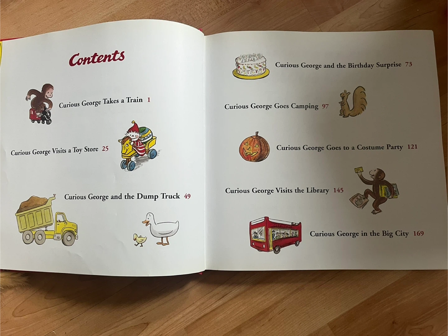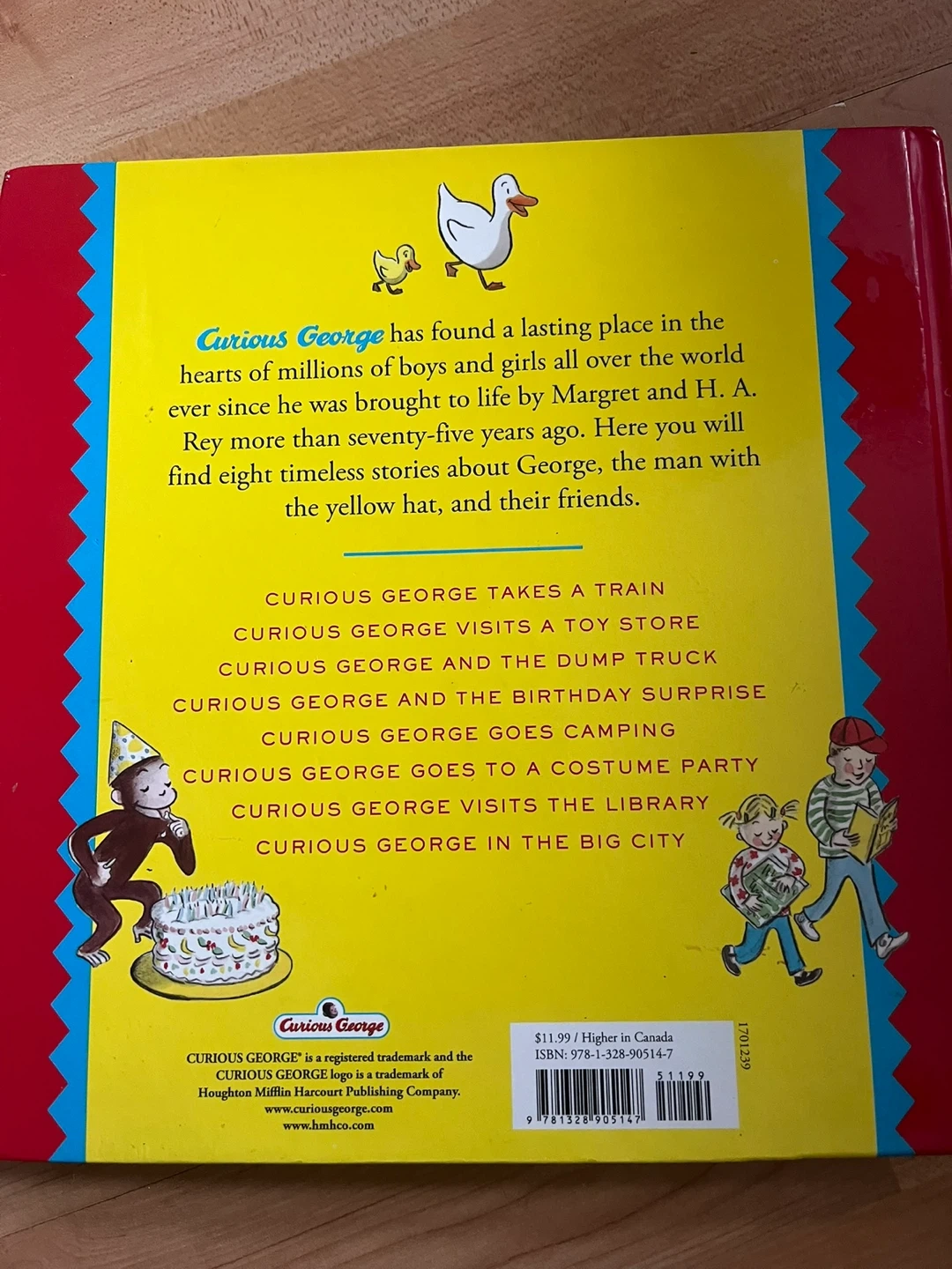 This is a treasury book featuring 8 timeless stories about Curious George by Margret and H.A. Rey. It includes titles like 'Curious George Takes a Train' and 'Curious George Goes Camping'. Young readers will enjoy the adventures of this beloved monkey character.