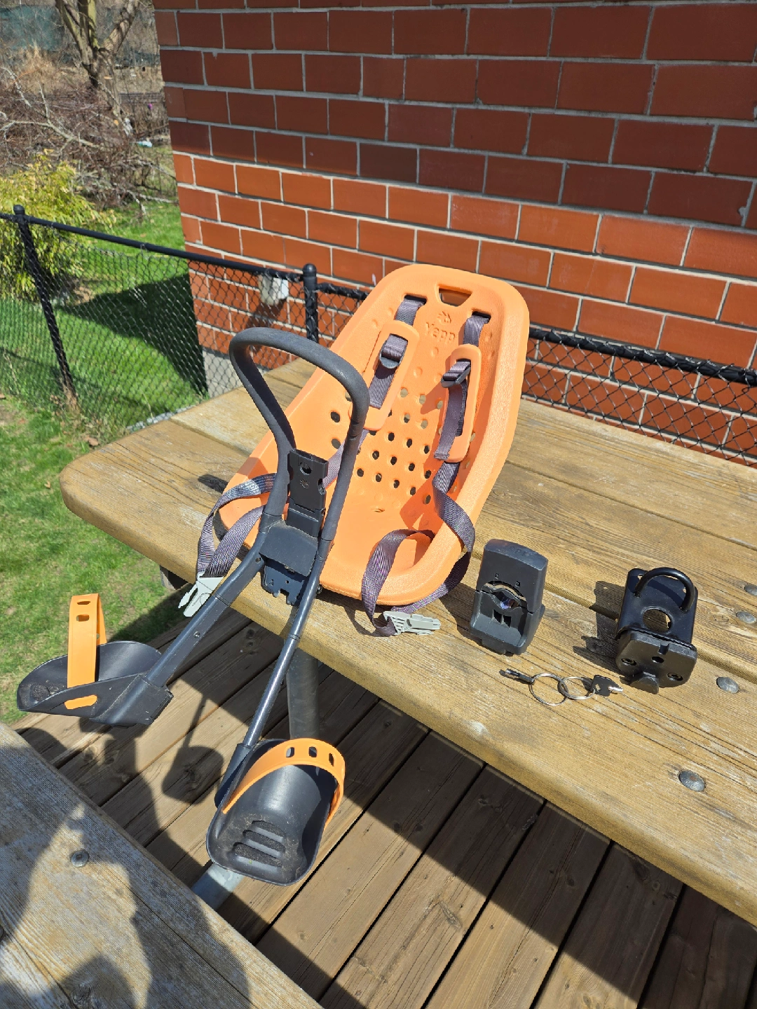 10Selling a used Yepp child bike seat in orange. It's in good condition and ready for your little one's adventures! Comes with all the necessary components for installation with a second clamp for another bike.