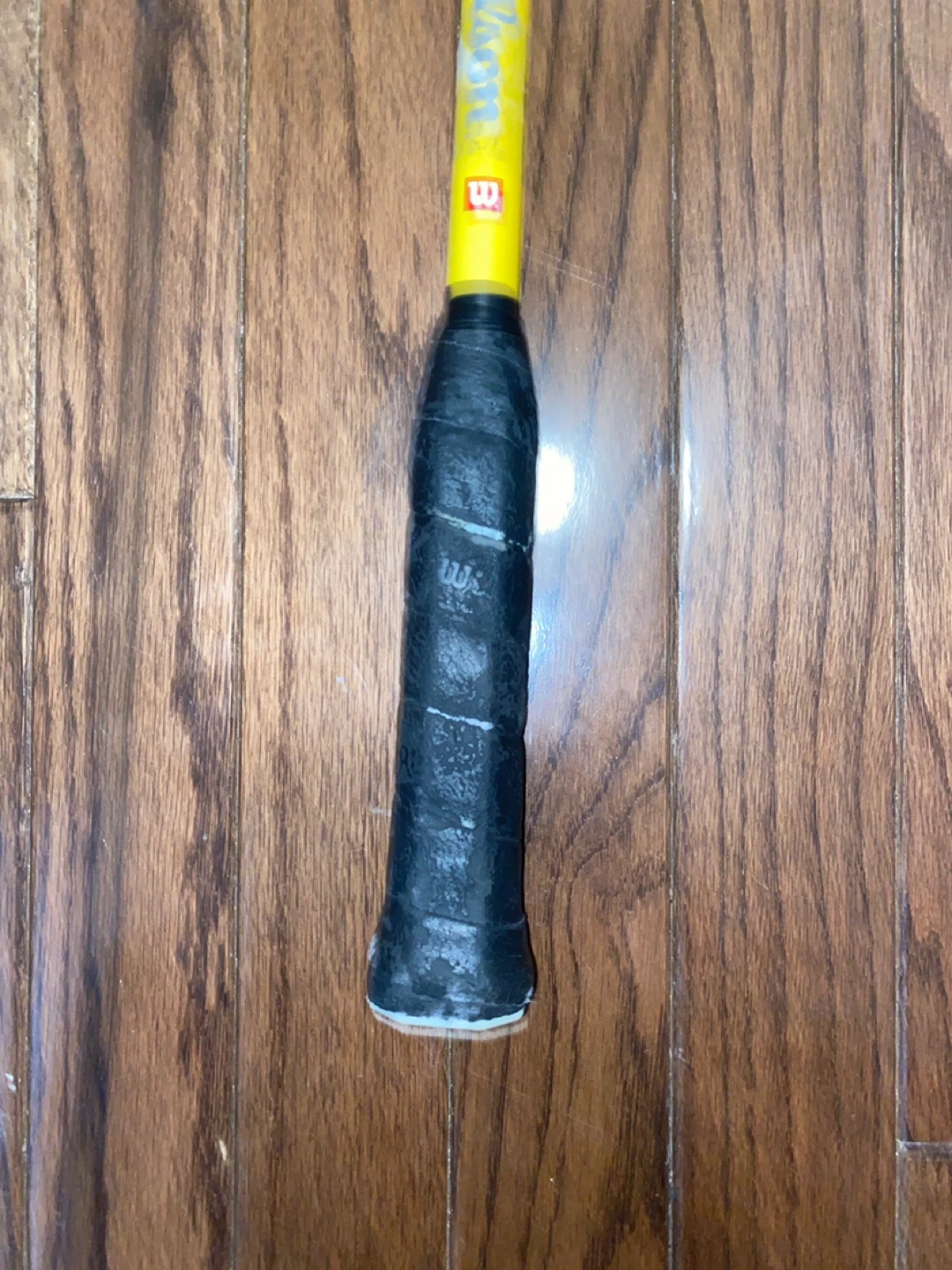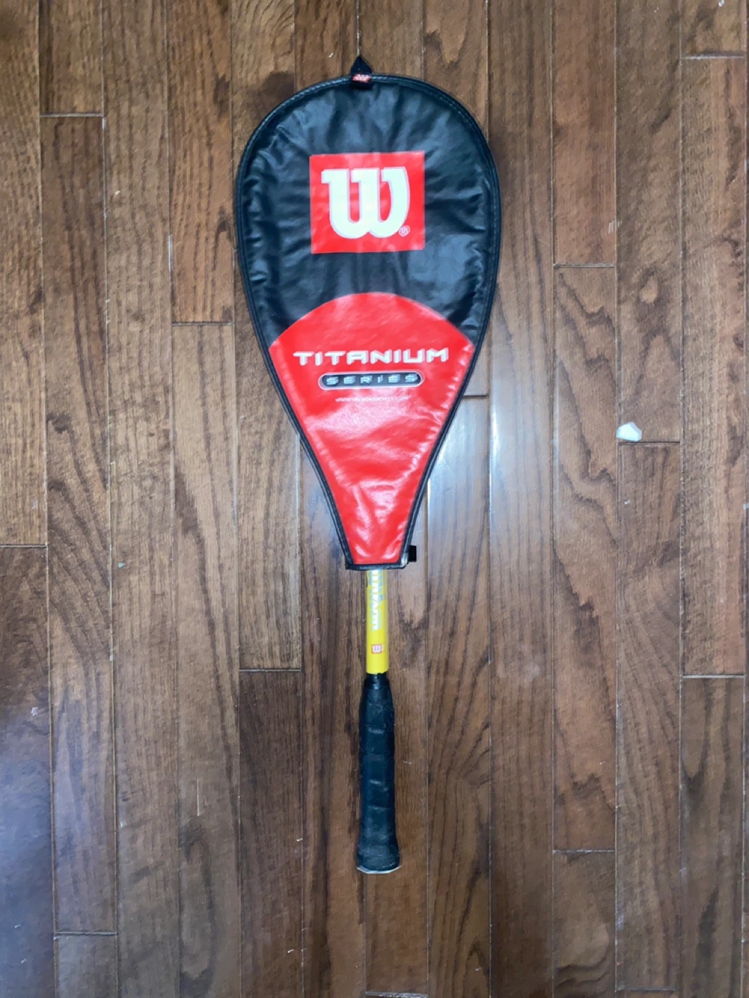 Wilson Titanium Series squash racquet. Yellow and black frame with a black grip. Comes with a protective cover. Grip is old and weathered. Could use a regripping.