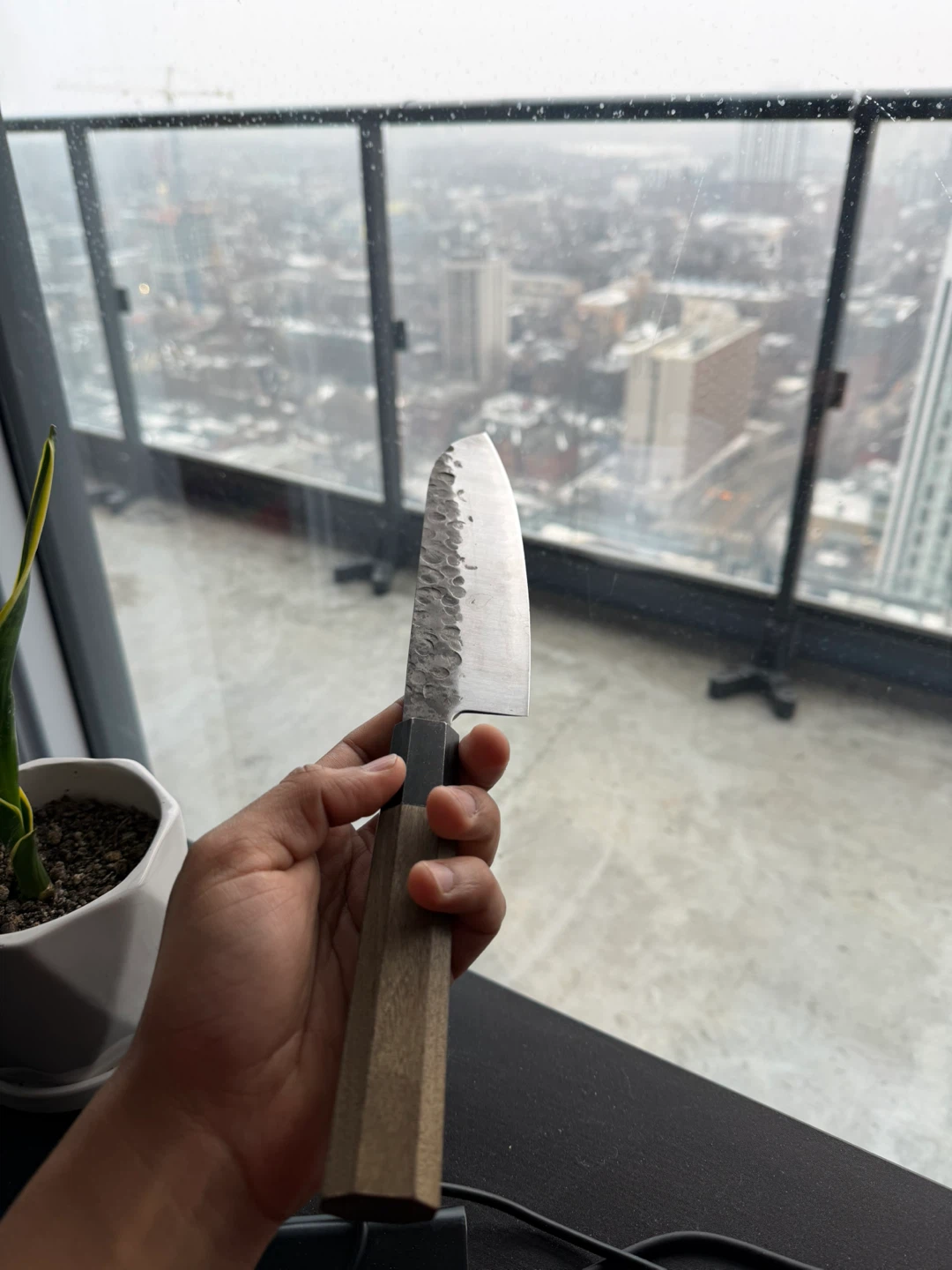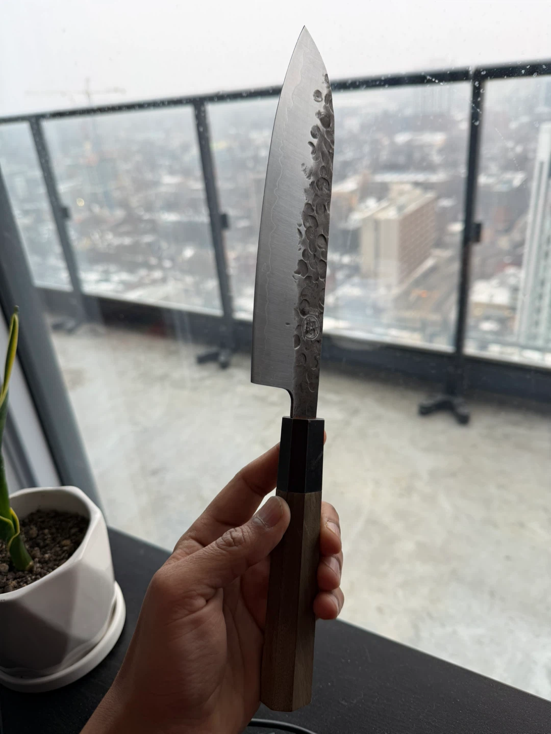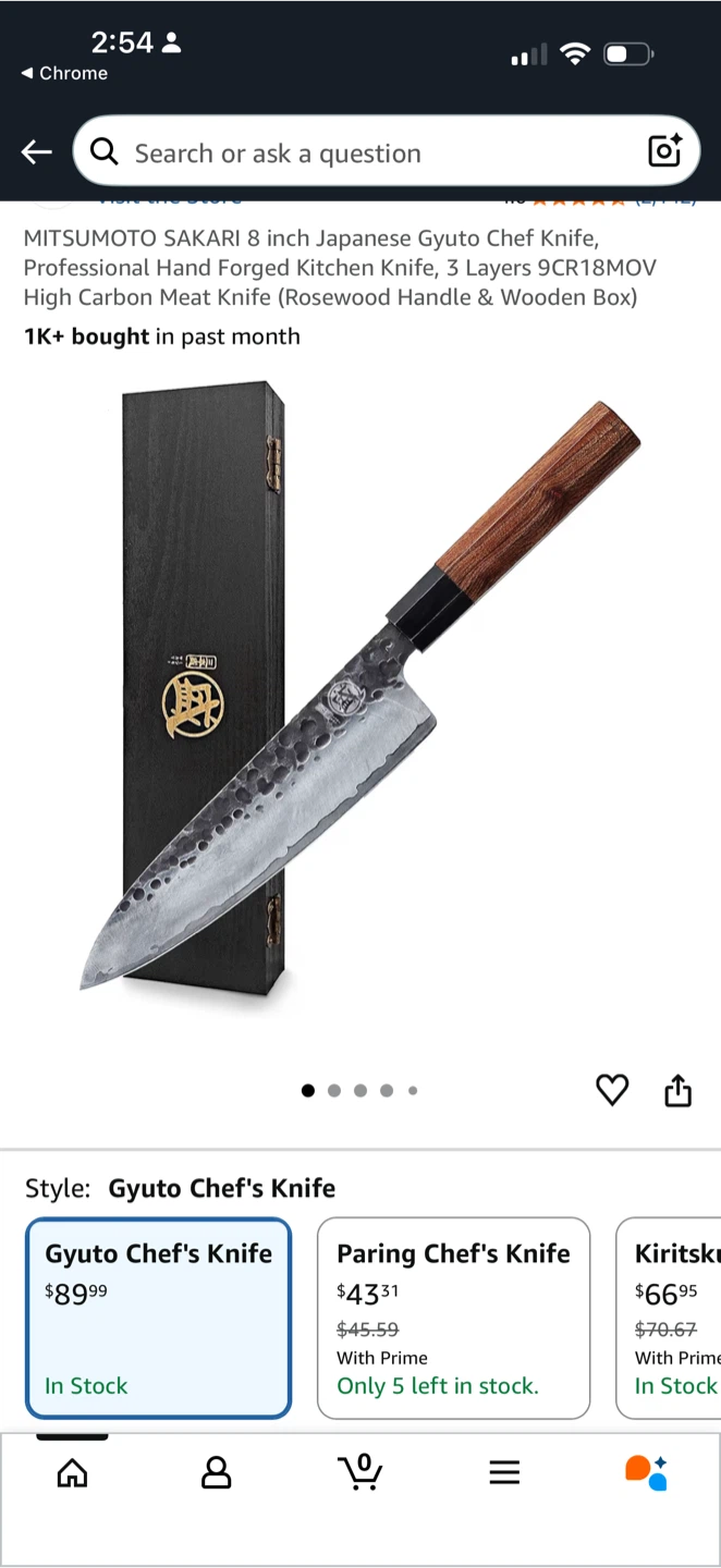 Selling a Mitsumoto Sakari 8-inch Japanese Gyuto Chef Knife. This professional hand-forged kitchen knife features 3 layers of 9CR18MOV high carbon meat knife and comes with a rosewood handle and wooden box. It's in great condition and ready for a new kitchen!
